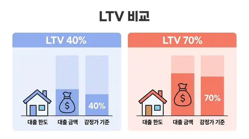 | LTV 한도 | 감정가 50~70% | 감정가 60~90% |