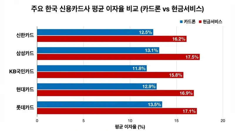 2025년 말 여신금융협회 공시 기준, 카드사별 카드론 금리 범위는 연 12~16% 수준이며, 신용점수 900점 초과 우량 고객은 연 6~10%대까지 낮아지기도 합니다. 그러나 현금서비스는 같은 신용점수라도 연 15~19%대가 적용되는 경우가 대부분이에요. 신용점수 700점 이하 구간에서는 현금서비스 금리가 사실상 법정 최고금리(20%)에 근접합니다.