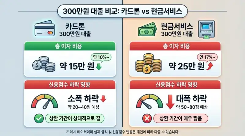 숫자로 보면 더 확실해집니다. 300만 원을 빌린다고 가정하고, 카드론과 현금서비스의 실질 이자 부담을 비교해 볼게요.