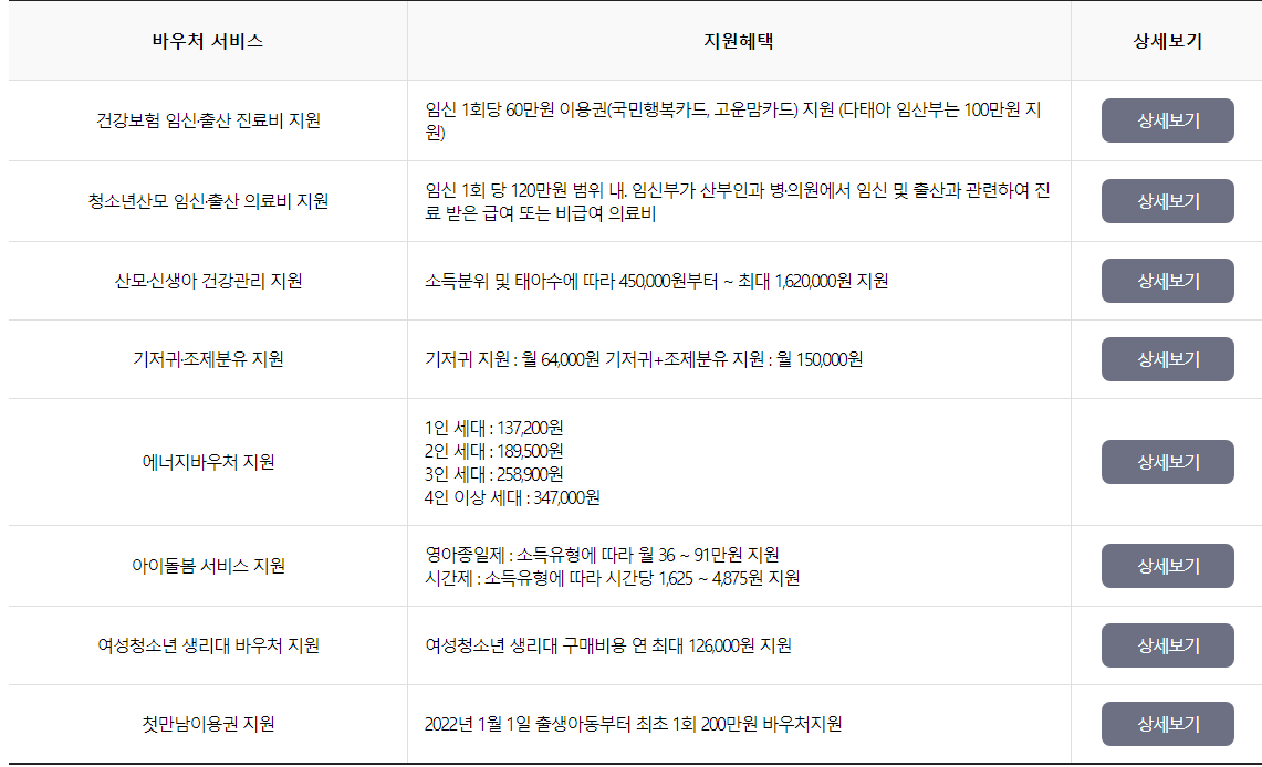 청소년 산모를 위한 지원 바우처로, 청소년 산모가 임신과 출산에 필요한 진료비를 지원받을 수 있습니다. 이 바우처 역시 국민행복카드를 통해 쉽게 이용 가능합니다.