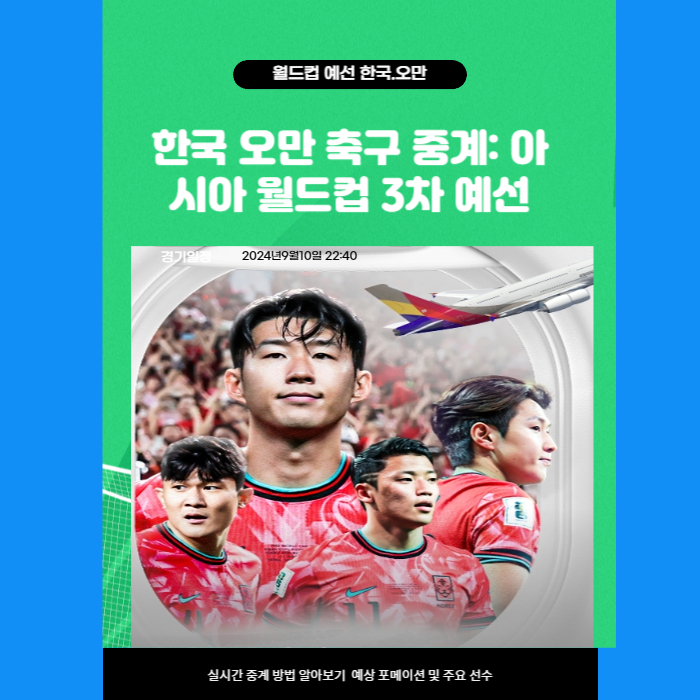 2024년 9월 10일, 한국 축구 국가대표팀은 오만과의 월드컵 아시아 3차 예선 경기를 치릅니다. 이번 경기는 오만의 수도 무스카트에 위치한 술탄 카부스 종합운동장에서 열리며, 한국 시간으로 밤 11시에 시작됩니다.