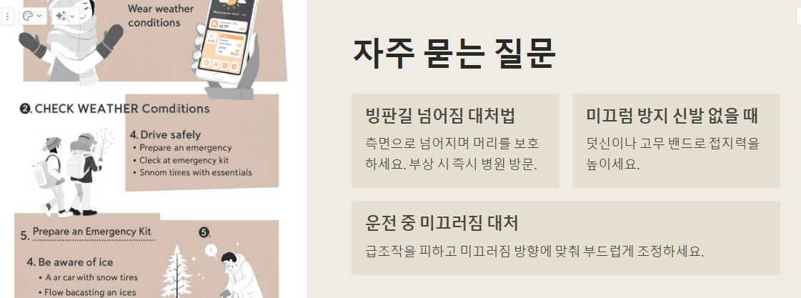 A3. 핸들을 너무 급히 돌리지 말고, 차량의 미끄러짐 방향에 맞춰 부드럽게 조정하세요. 급브레이크는 절대 금지입니다!
