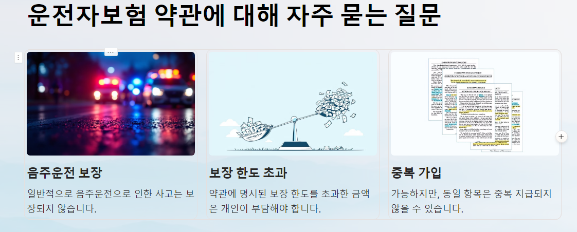 💡 TIP: 약관에 “운전 중 사고”라는 문구가 반드시 포함되어 있는지 확인하세요. 일부 약관에서는 사고 유형에 따라 보장이 제한될 수 있습니다.