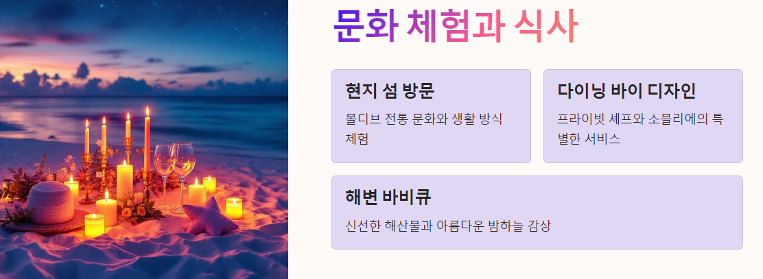 • 현지 섬 방문: 몰디브 전통 문화와 현지 주민들의 생활 방식을 직접 체험할 수 있습니다.
