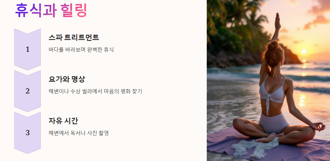 • 요가와 명상: 해변이나 수상 빌라에서 요가와 명상을 하며 마음의 평화를 찾을 수 있습니다.