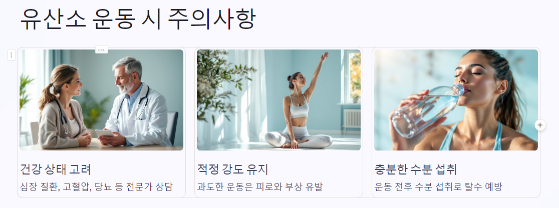 - 건강 상태 고려: 심장 질환, 고혈압, 당뇨 등이 있는 경우 전문가 상담 후 운동 계획을 세우세요.