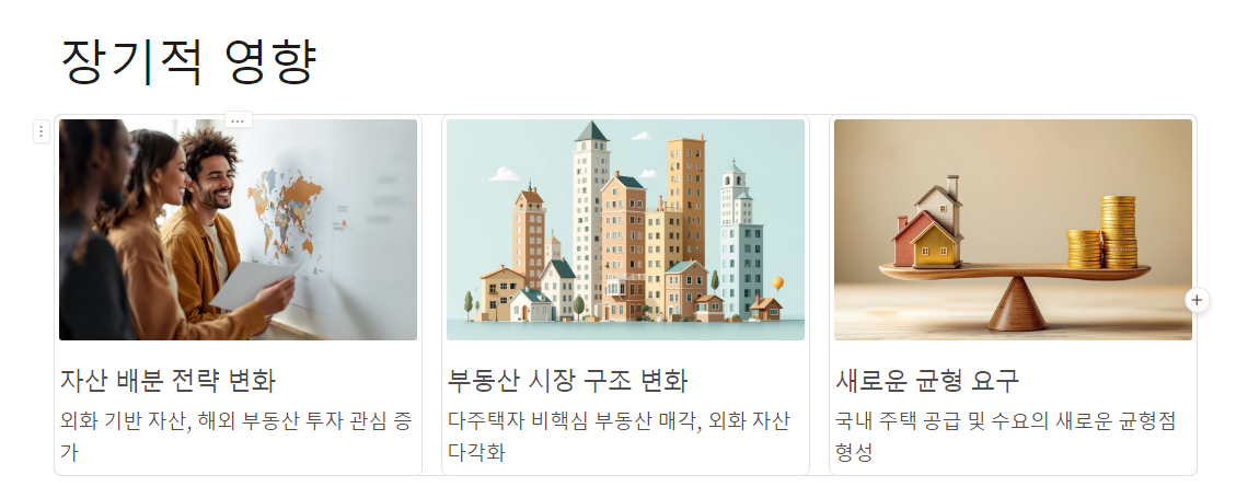 • 예를 들어, 다주택자들이 비핵심 부동산을 매각하여 외화 자산으로 다각화하려는 움직임이 나타날 수 있습니다.