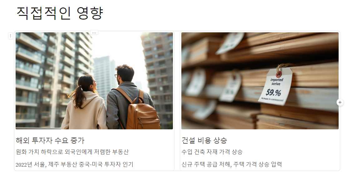 • 일부 투자자들은 원화 자산의 가치 하락을 우려하여 외화 기반 자산으로 이동하거나 해외 부동산 투자에 관심을 가지게 됩니다.