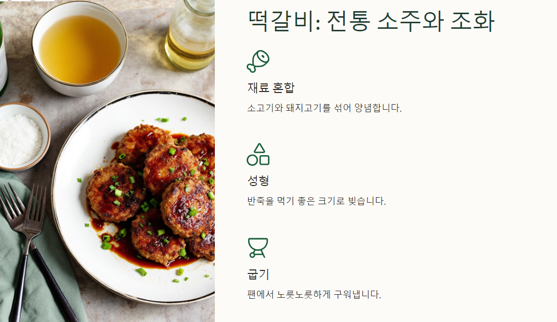 전통 소주의 쌉싸름한 맛이 떡갈비의 달콤짭짤한 풍미와 만나 감칠맛을 극대화합니다. 🍖