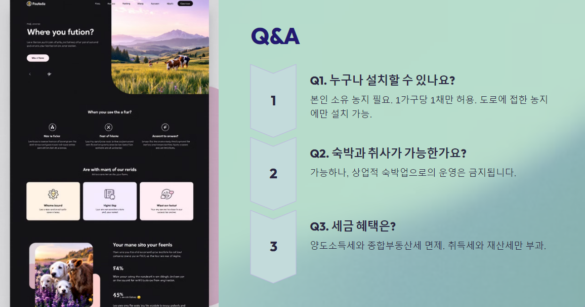 A1. 본인 소유의 농지가 있어야 하며, 1가구당 1채만 허용됩니다. 도로에 접하지 않거나 제한 구역에 있는 농지에서는 설치가 불가능합니다.