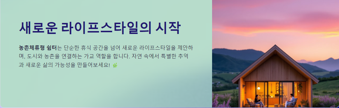 농촌체류형 쉼터는 단순한 휴식 공간을 넘어 새로운 라이프스타일을 제안하며, 도시와 농촌을 연결하는 가교 역할을 합니다. 자연 속에서 특별한 추억과 새로운 삶의 가능성을 만들어보세요! 🌿