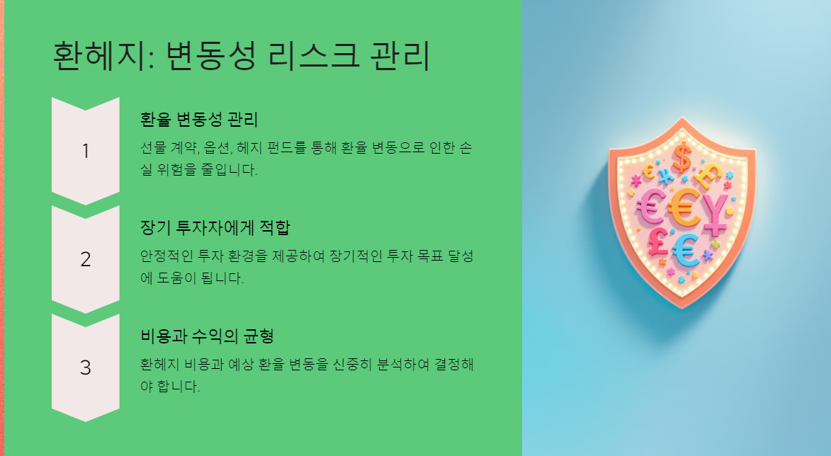 환헤지는 선물 계약이나 옵션을 통해 이루어지며, 전문 금융기관의 도움을 받을 수 있습니다.