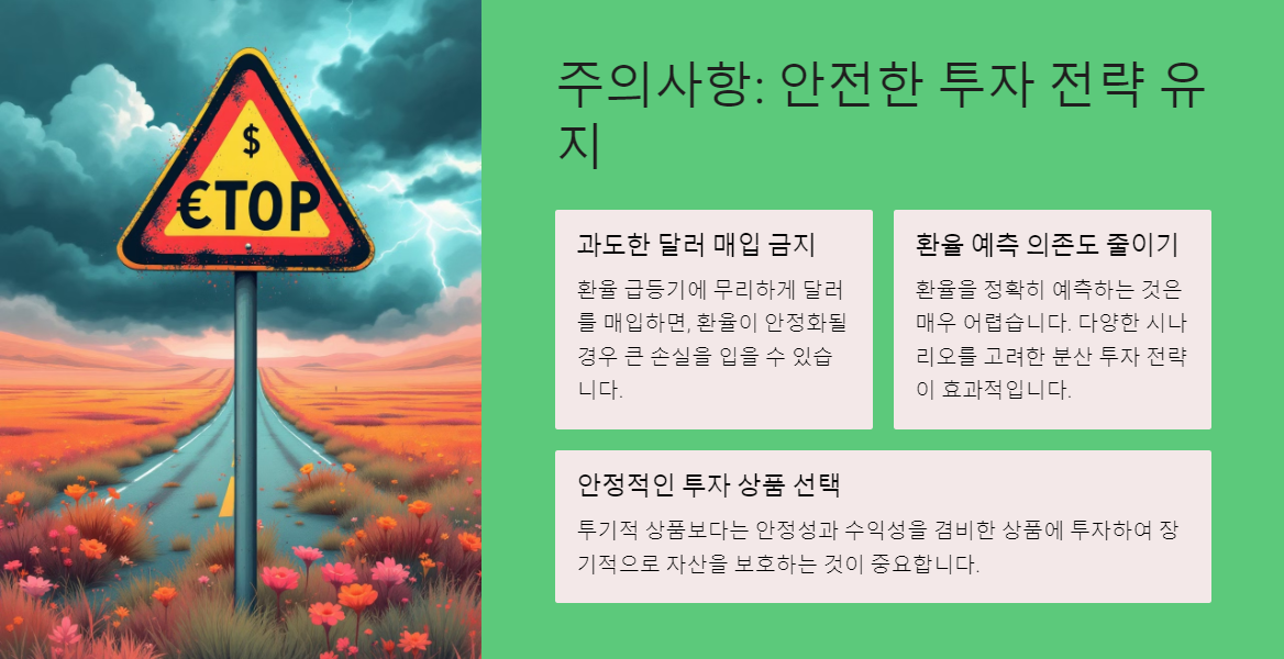 환율 급등기에 무리하게 달러를 매입하면, 환율이 안정화될 경우 큰 손실을 입을 수 있습니다. 균형 잡힌 접근이 필수적입니다.