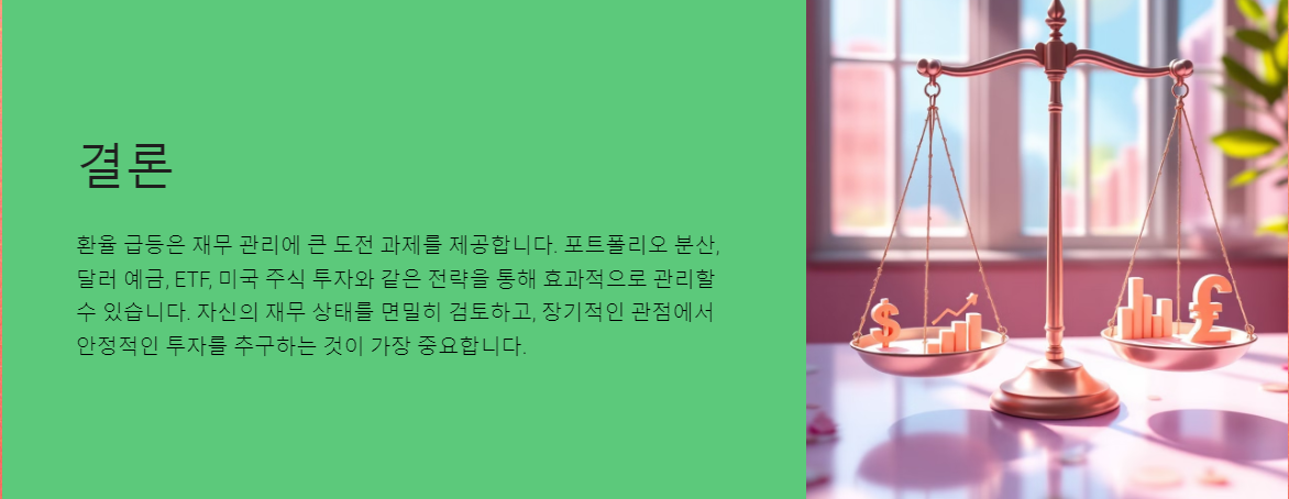 환율 급등은 재무 관리에 큰 도전 과제를 제공합니다. 그러나 포트폴리오 분산, 달러 예금, ETF, 미국 주식 투자와 같은 전략을 통해 이를 효과적으로 관리할 수 있습니다. 무엇보다 중요한 것은 자신의 재무 상태를 면밀히 검토하고, 장기적인 관점에서 안정적인 투자를 추구하는 것입니다.