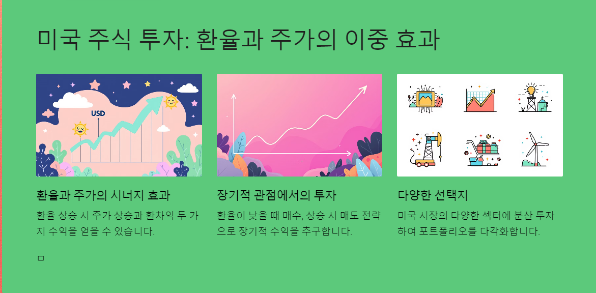 미국 시장은 기술주, 헬스케어, 소비재 등 다양한 섹터에 투자할 기회를 제공하며, 이를 통해 투자자들은 특정 산업의 성장성과 환율 변동을 동시에 활용할 수 있습니다. 이러한 다변화된 투자 기회는 안정성과 수익성을 모두 보장합니다.