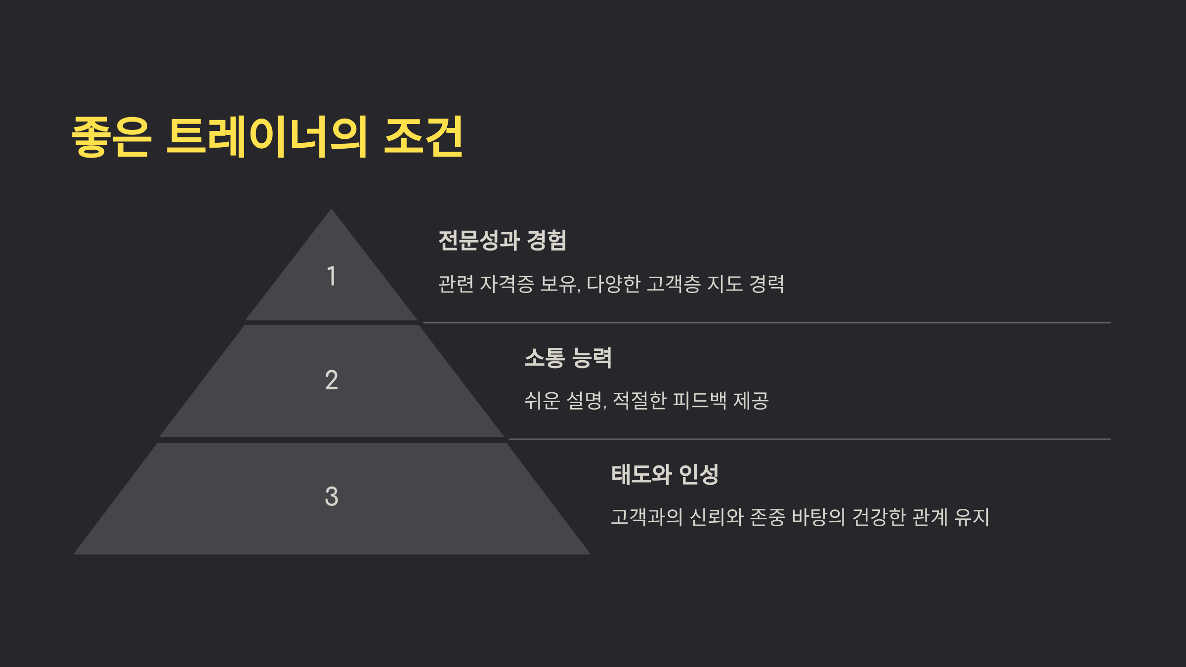 좋은 트레이너를 찾는 것은 운동의 성공 여부를 결정짓는 중요한 요소 중 하나예요. 트레이너의 가장 중요한 조건은 전문성과 경험이에요. 관련 자격증을 보유하고, 다양한 고객층을 지도한 경력이 있는 트레이너는 초보자에게 더 나은 방향성을 제시할 수 있답니다. 특히, 초보자에게는 운동 자세 교정과 근력 강화를 위해 전문 트레이너의 역할이 필수적이에요.