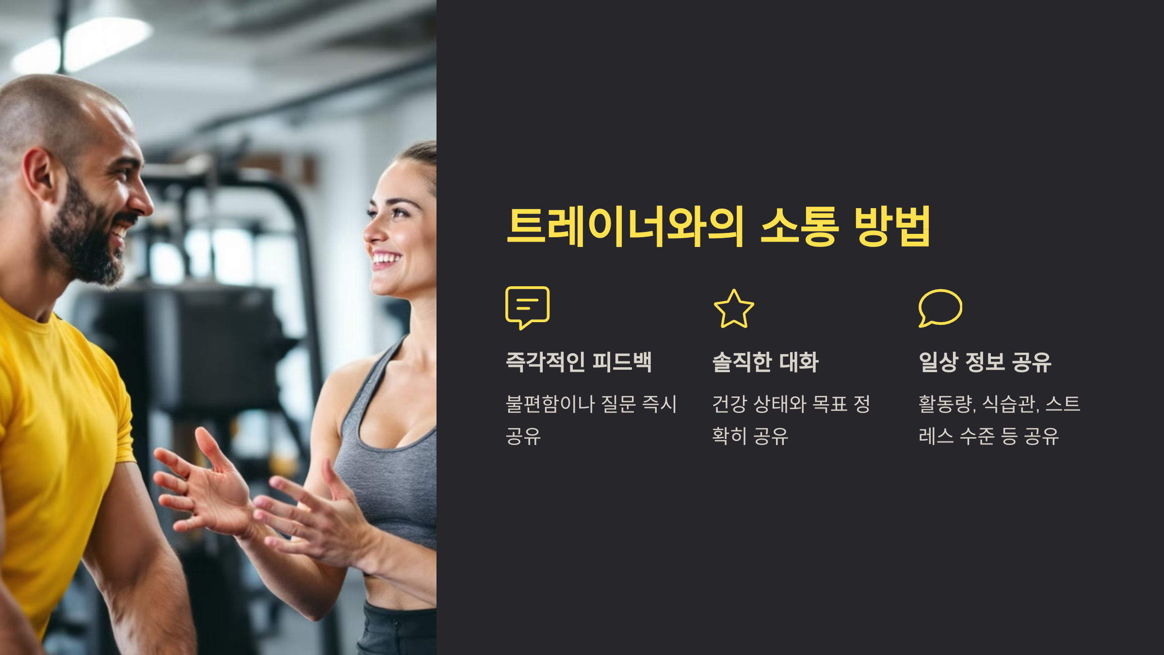 트레이너와의 관계는 단순히 지도자와 고객의 관계를 넘어선 협력적인 관계예요. 트레이너의 조언을 잘 따르되, 자신의 생각이나 아이디어를 공유하면서 함께 목표를 향해 나아가는 것이 중요해요. 이러한 소통은 운동의 재미와 동기 부여를 더욱 높여줄 거예요.
