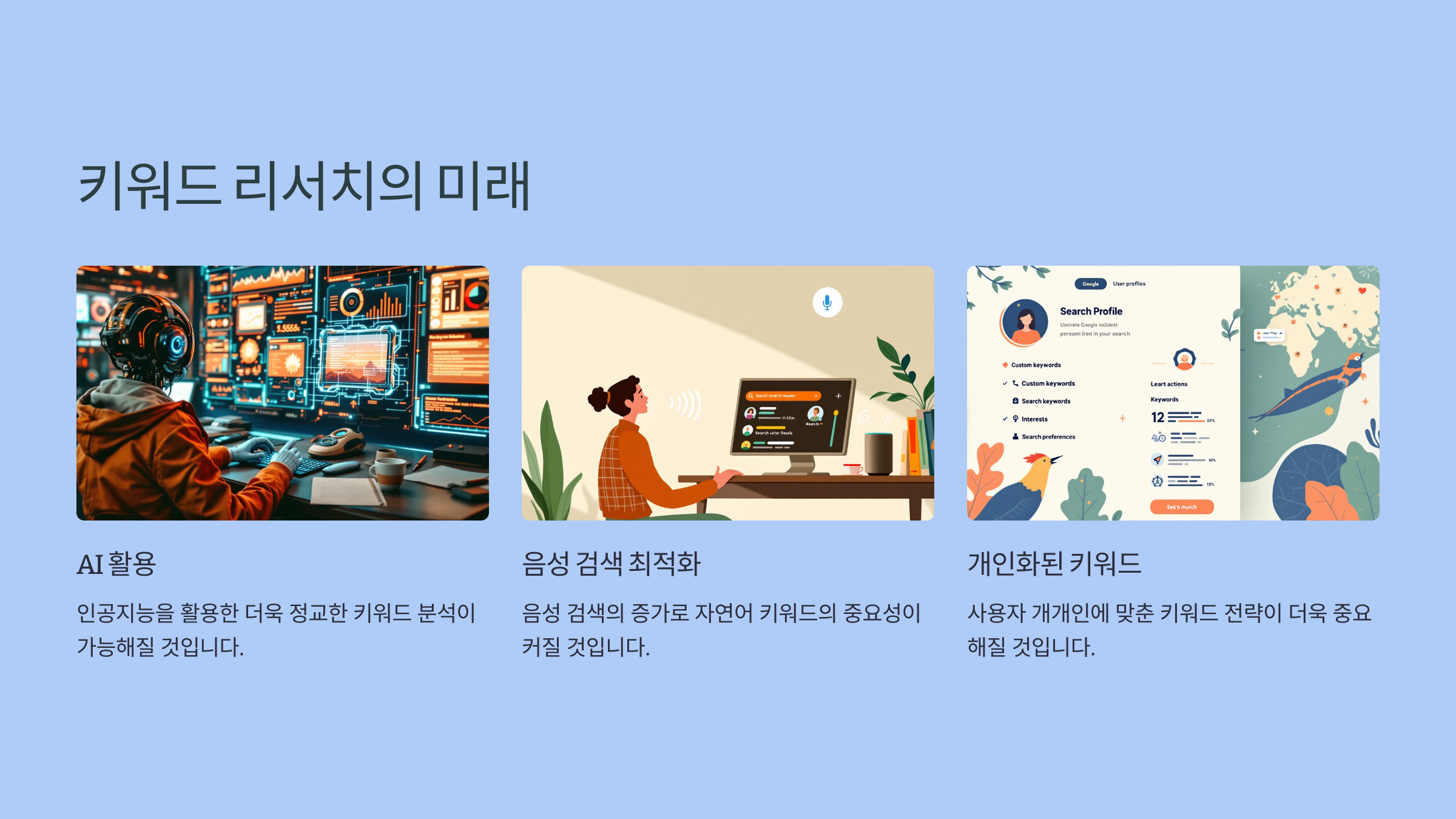 내가 생각했을 때 키워드 리서치는 단순히 검색량 높은 단어를 찾는 것을 넘어, 실제 사용자 의도와 그들의 문제를 해결하는 콘텐츠를 만드는 과정이에요. 키워드 리서치는 데이터 기반의 분석과 창의적인 접근 방식이 결합되어야만 진정한 효과를 발휘해요.