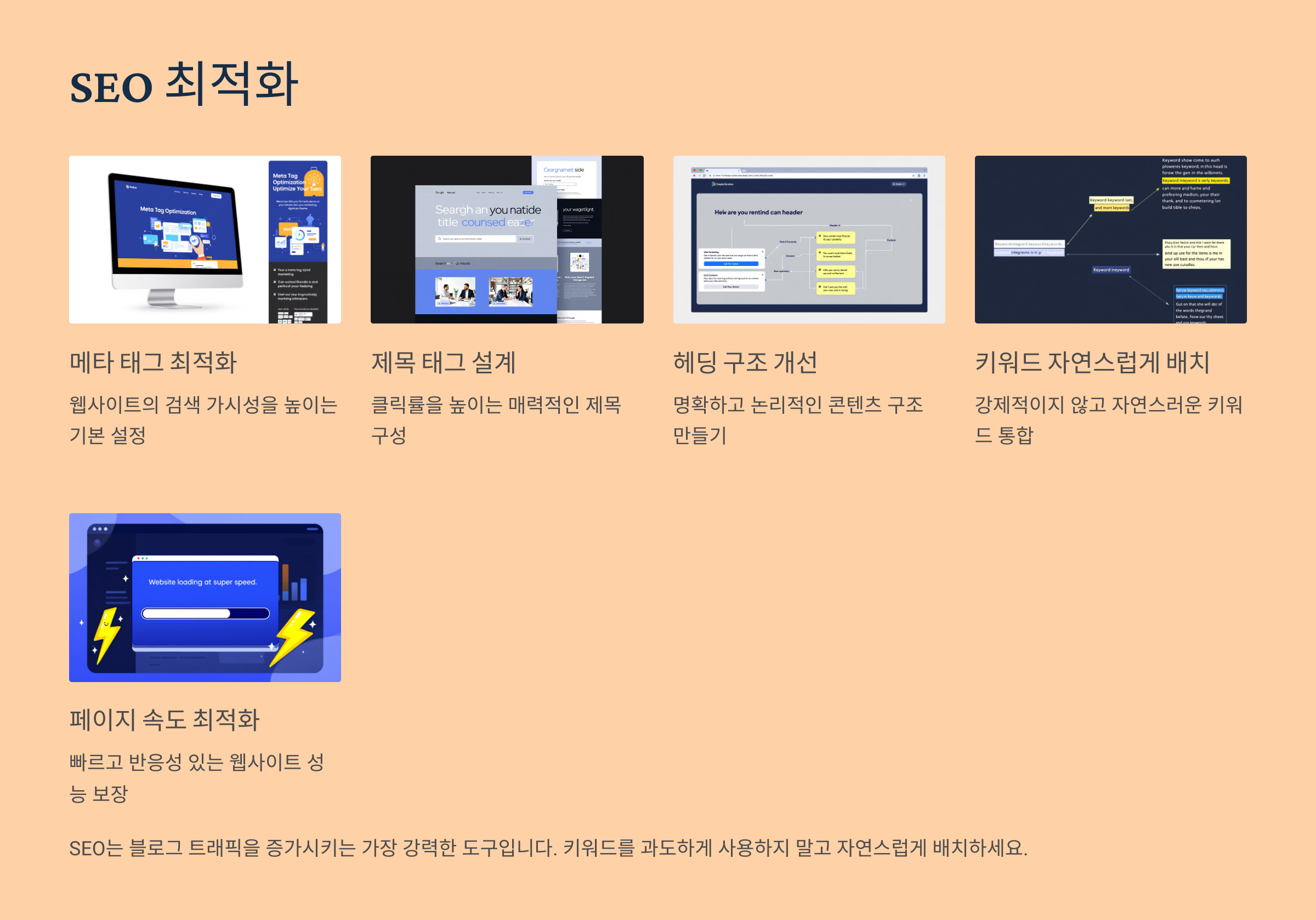 검색 엔진 최적화(SEO)는 블로그 트래픽을 증가시키는 가장 강력한 도구 중 하나예요. SEO를 효과적으로 적용하려면 **메타 태그**, **제목 태그**, 그리고 **헤딩 구조**를 꼼꼼히 설계해야 해요.