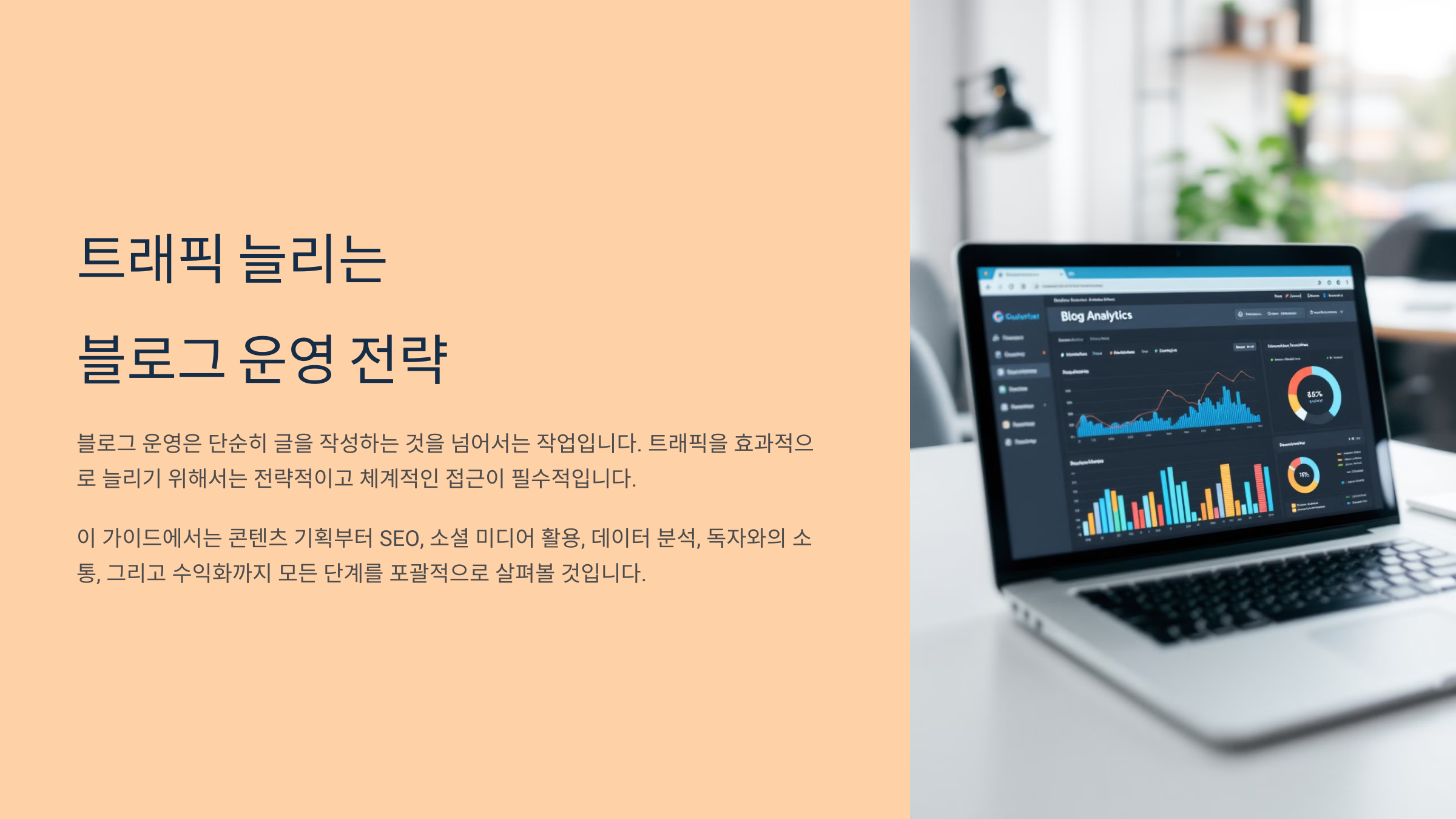 이번 글에서는 블로그 트래픽을 효과적으로 증가시킬 수 있는 다양한 방법을 다룰 거예요. 콘텐츠 기획부터 SEO, 소셜 미디어 활용, 데이터 분석, 독자와의 소통, 그리고 수익화까지 모든 단계를 포괄적으로 살펴볼게요. 처음 시작하거나, 이미 운영 중인 블로그를 더 성장시키고 싶다면 이 가이드를 참고해보세요.
