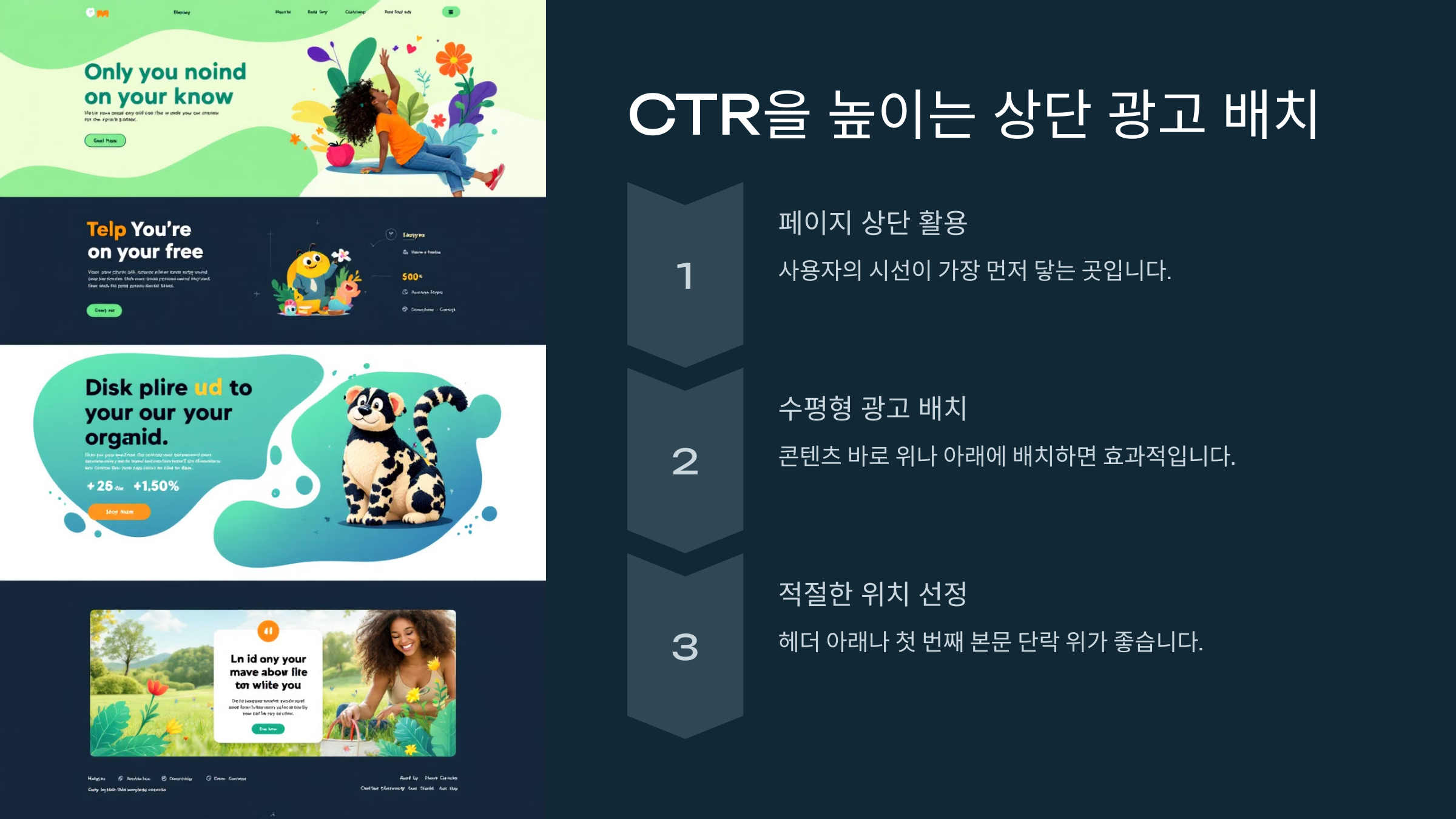 웹사이트에서 **페이지 상단**은 가장 주목받는 영역이에요. 사용자 대부분이 페이지를 처음 열었을 때 상단부터 시선을 두기 때문에, 이곳에 광고를 배치하면 높은 클릭률(CTR)을 기대할 수 있어요.