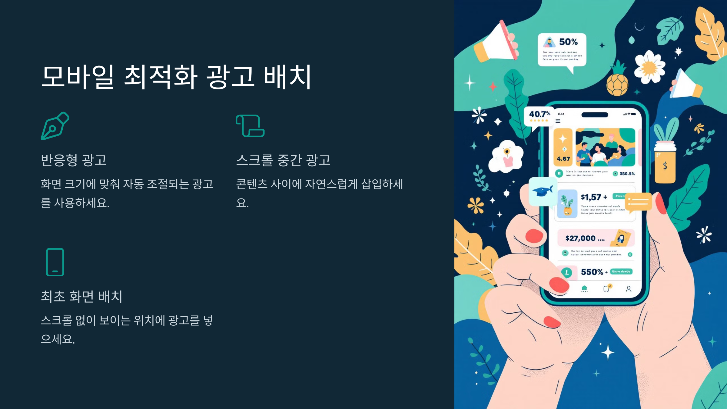 또한, 모바일에서는 **최초 화면(Fold 위)**에 광고를 배치하는 것이 중요해요. 사용자가 화면을 내리지 않아도 보이는 위치에 광고를 배치하면 더 많은 클릭과 노출이 발생할 수 있답니다.