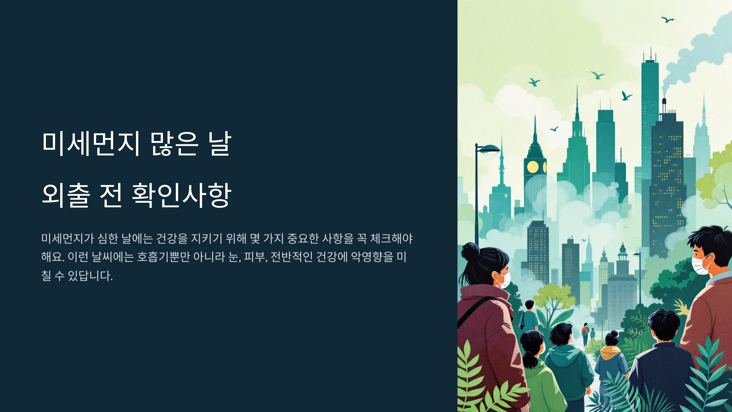외출 전 가장 먼저 해야 할 일은 미세먼지 농도를 확인하는 거예요. 미세먼지는 PM10(입자가 상대적으로 큰 먼지)과 PM2.5(더 작은 입자)로 나뉘며, PM2.5는 폐 깊숙이 침투해 건강에 큰 영향을 미쳐요. 정부에서 제공하는 어플리케이션이나 날씨 앱을 사용하면 실시간으로 미세먼지 농도를 확인할 수 있어요.