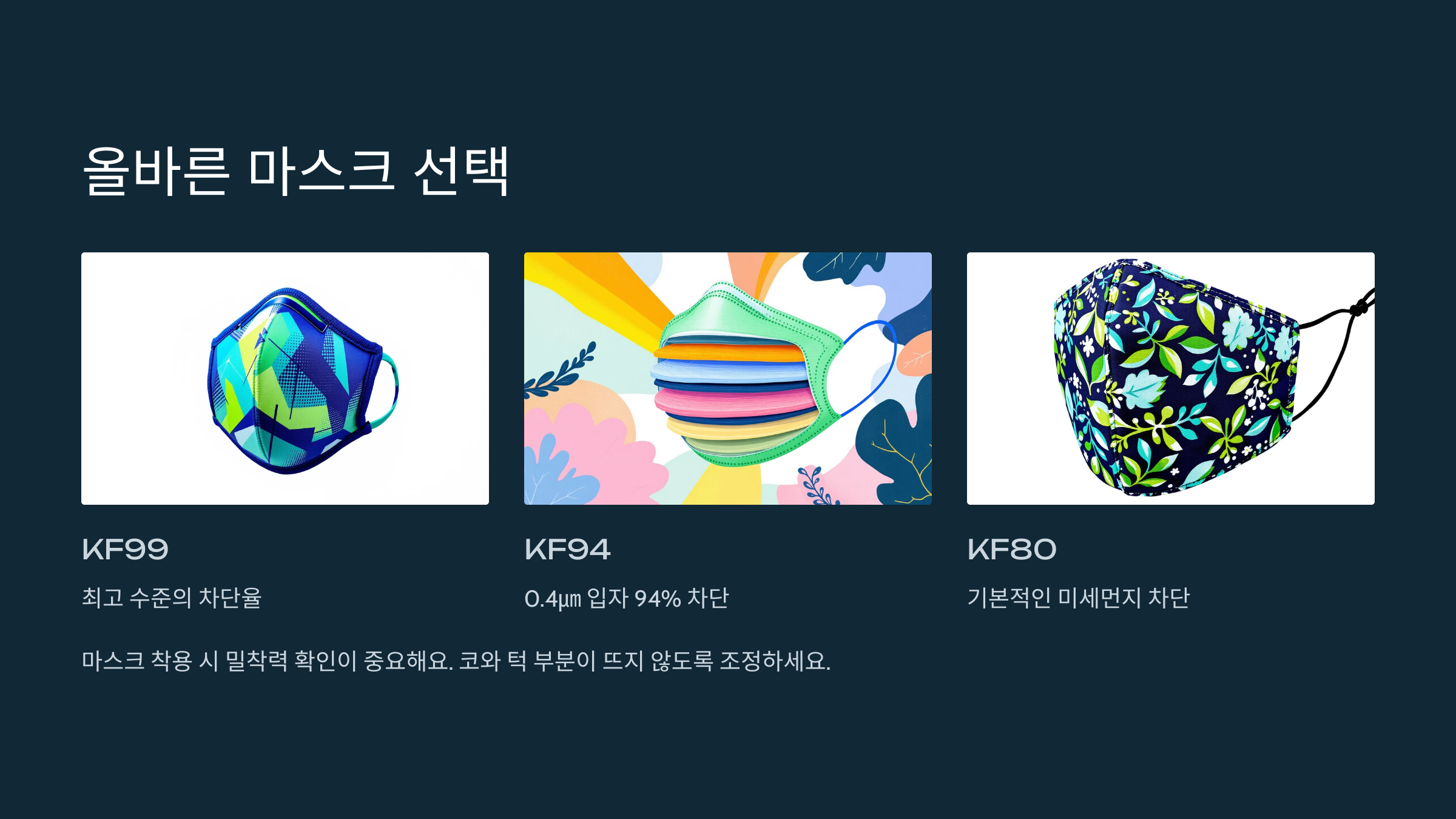 미세먼지로부터 호흡기를 보호하기 위해서는 KF 인증을 받은 마스크를 사용하는 것이 좋아요. KF80, KF94, KF99 중 상황에 따라 선택하면 되는데, 이 숫자는 미세먼지 차단율을 나타내요. 예를 들어, KF94는 0.4㎛ 크기의 입자를 94% 차단할 수 있다는 뜻이에요.