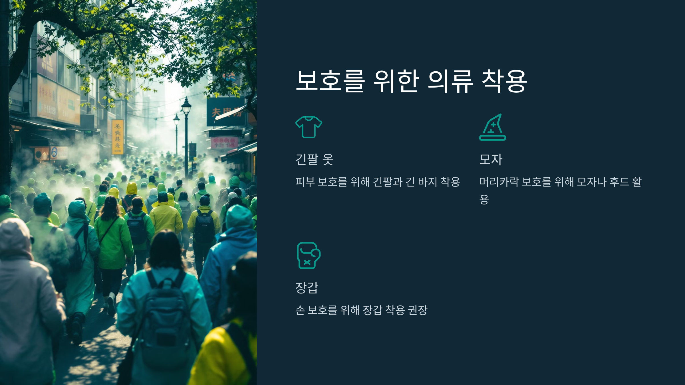 미세먼지가 많은 날에는 피부에 먼지가 직접 닿지 않도록 신경 써야 해요. 가능한 긴팔 옷과 긴 바지를 착용하는 것이 좋고, 밝은 색상의 옷은 먼지가 덜 묻는 효과가 있어요. 머리카락도 미세먼지를 흡수하기 쉬우니 모자나 후드를 활용하는 것이 좋아요.