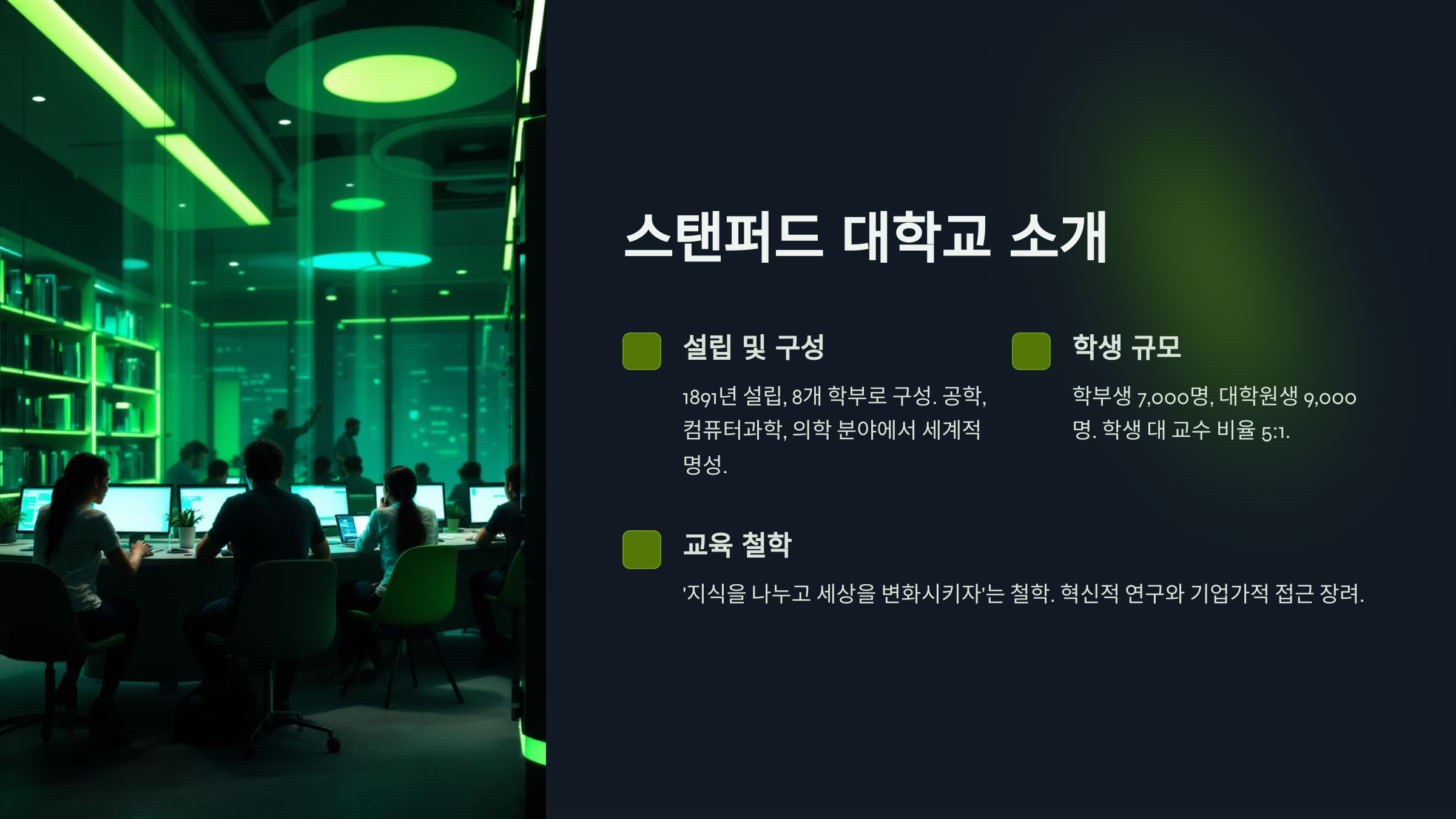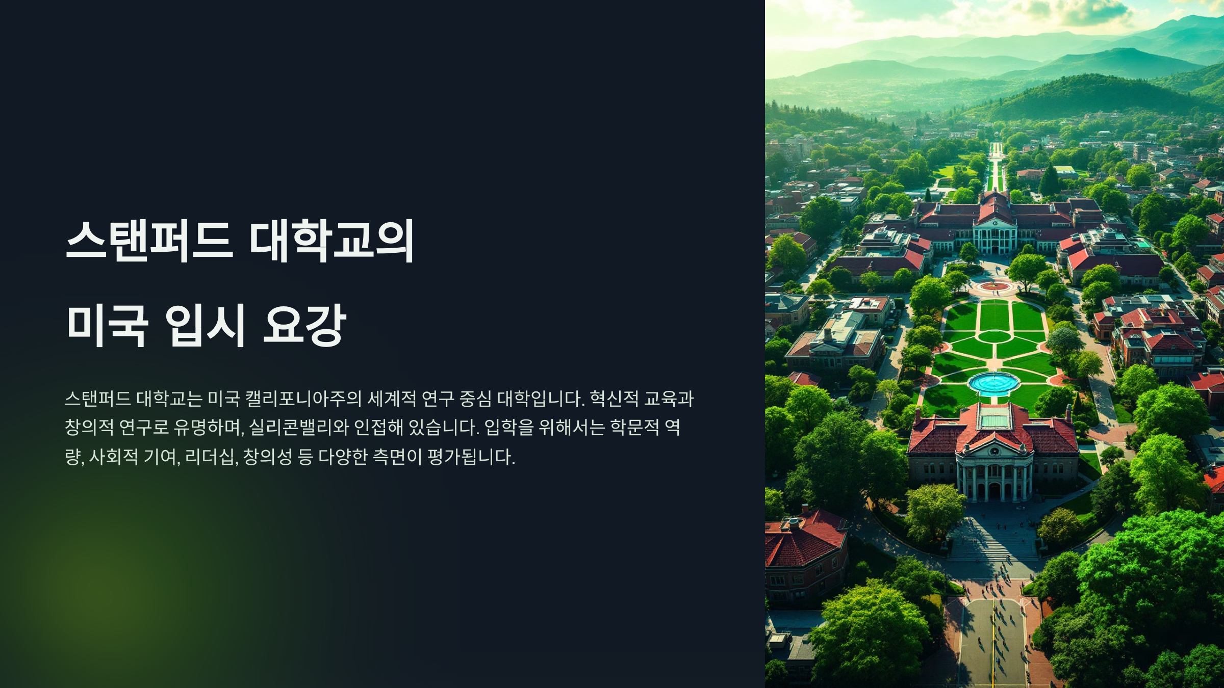 스탠퍼드 대학교는 미국 캘리포니아주에 위치한 세계적으로 권위 있는 연구 중심 대학이에요. 전 세계의 우수한 학생들이 몰리는 곳으로, 특히 혁신적인 교육과 창의적인 연구로 유명해요. 스탠퍼드는 실리콘밸리와 인접해 있어 기술과 기업가 정신의 중심지로도 잘 알려져 있답니다.