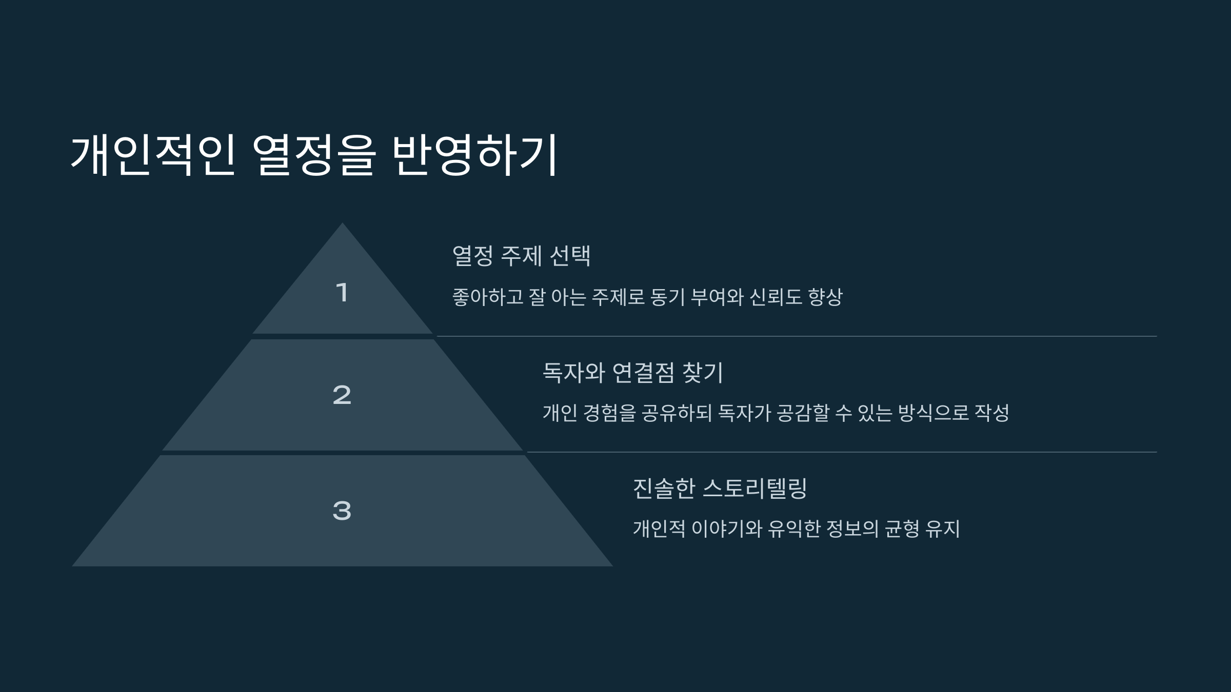 내가 생각했을 때, 열정을 기반으로 한 콘텐츠는 긴 호흡으로 운영되는 블로그에서 특히 강점을 발휘해요. 본인이 좋아하는 주제라면 1년이 지나도 흥미를 잃지 않고 꾸준히 성장할 수 있답니다.