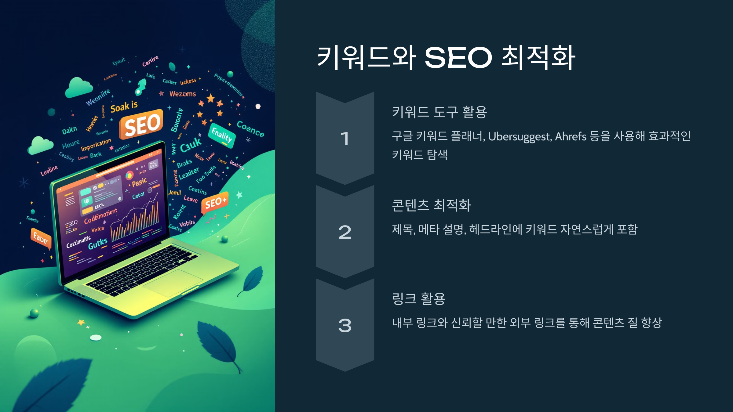 블로그 성공을 위해 SEO(검색 엔진 최적화)는 필수적이에요. 검색 엔진에서 상위 노출을 위해서는 적절한 키워드를 찾아 콘텐츠에 자연스럽게 녹이는 것이 중요해요. 구글 키워드 플래너, Ubersuggest, Ahrefs 같은 도구를 활용하면 효과적인 키워드를 탐색할 수 있어요.