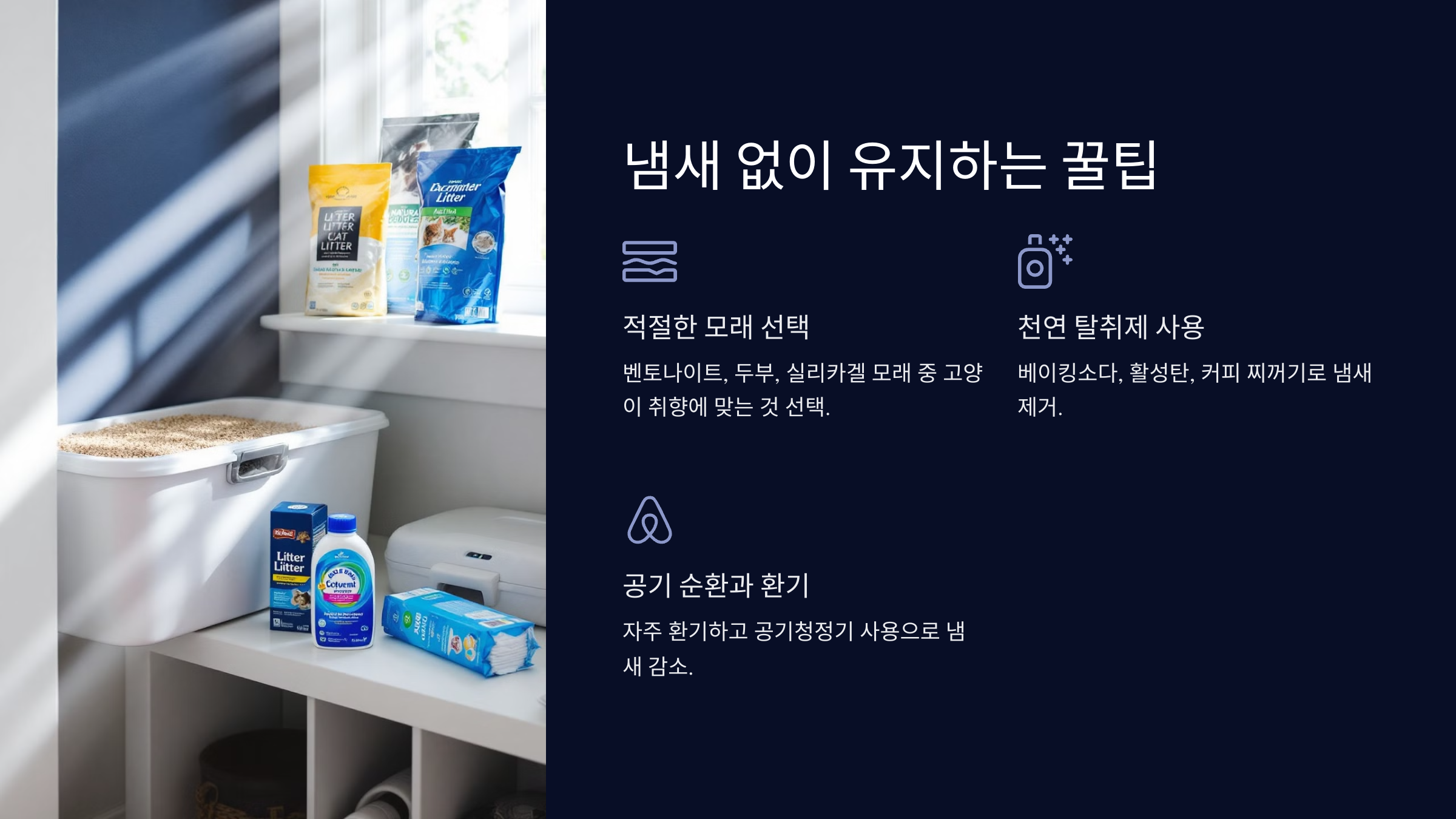 A. 탈취력이 좋은 모래를 사용하고, 베이킹소다나 활성탄 같은 천연 탈취제를 활용하세요.