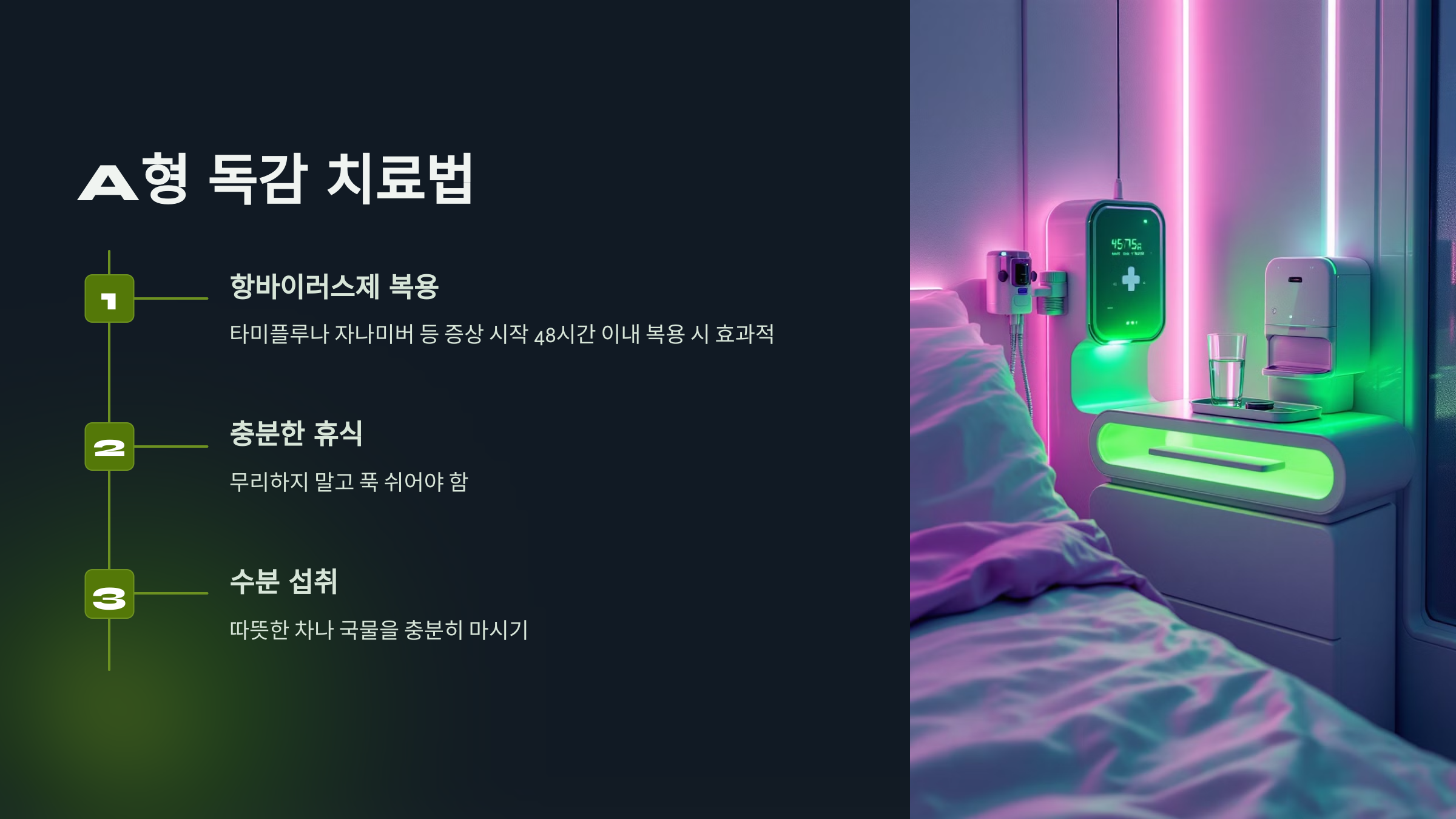 A형 독감 치료는 주로 항바이러스제 복용과 충분한 휴식으로 이루어져요. 타미플루(Oseltamivir)나 자나미버(Zanamivir) 같은 항바이러스제가 처방될 수 있어요.