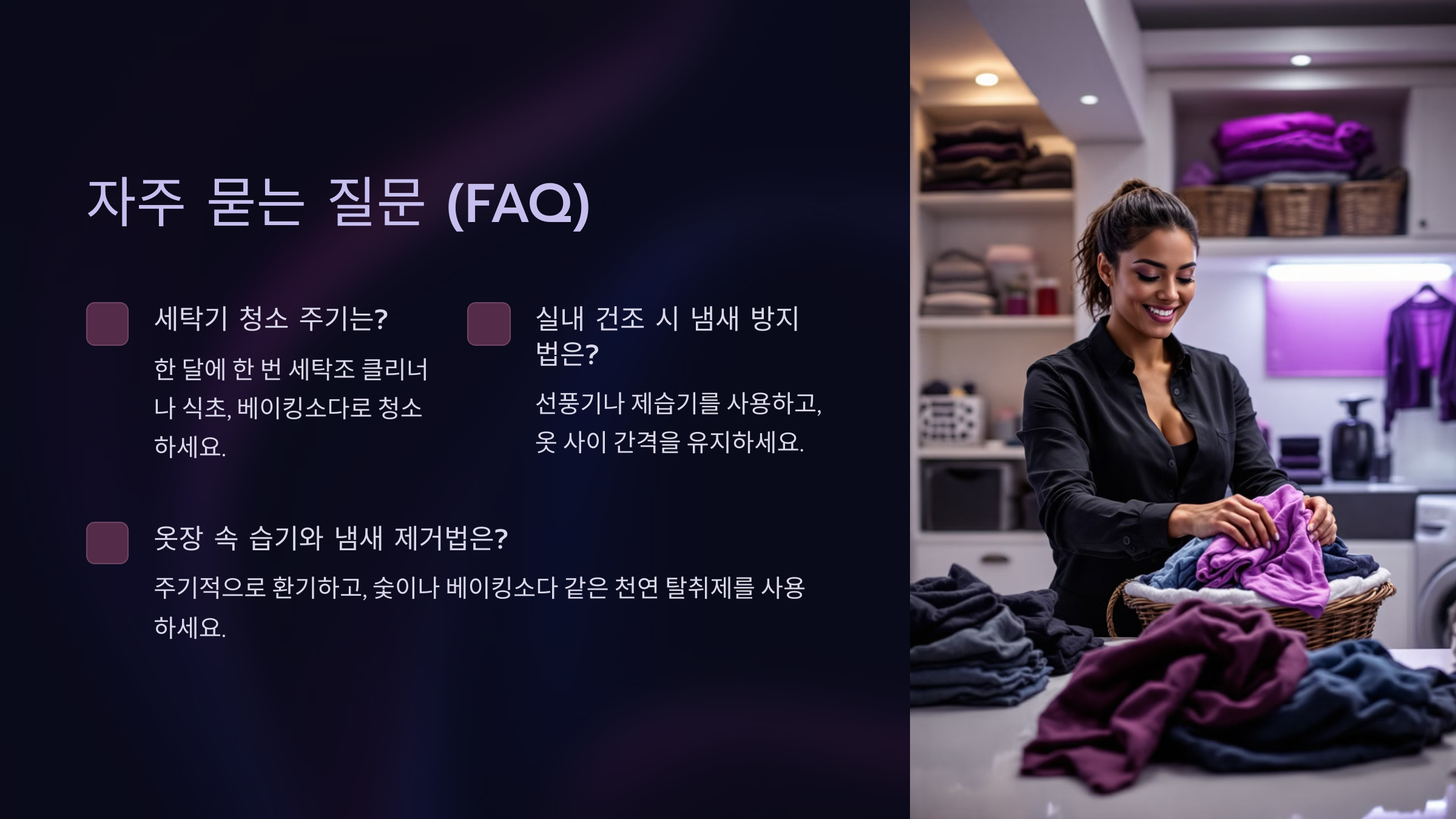 A4. 한 달에 한 번 세탁조 클리너나 식초, 베이킹소다를 이용해 청소하면 냄새와 곰팡이를 예방할 수 있어요.