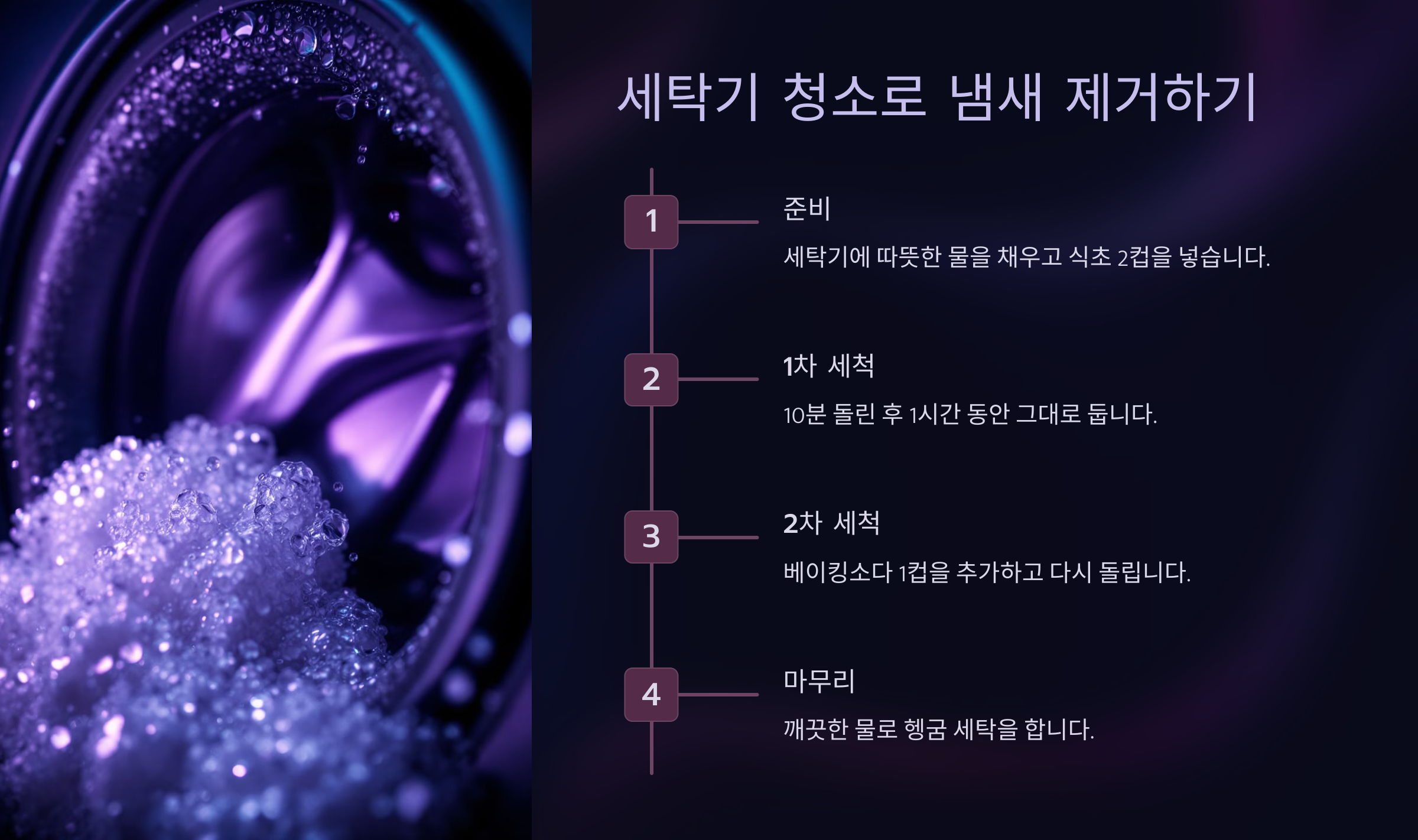 | 고무 패킹에 직접 닿지 않도록 | 세탁기 고무 패킹에 식초가 지속적으로 닿으면 변형될 수 있어요. |