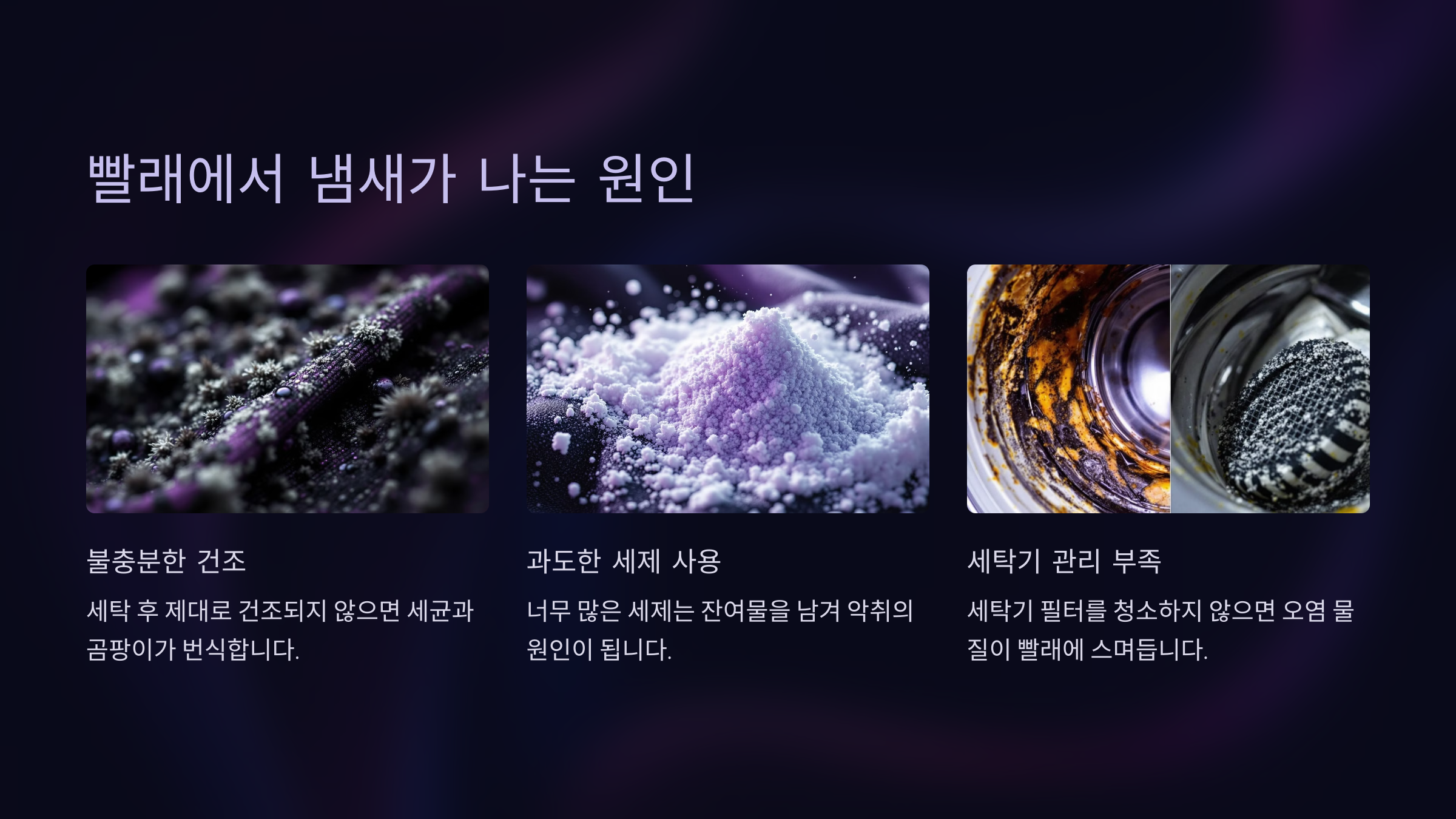 A6. 세탁기 내부 오염, 헹굼 부족, 습한 환경에서의 건조 등이 원인이에요. 세탁기 청소와 적절한 건조가 중요해요.