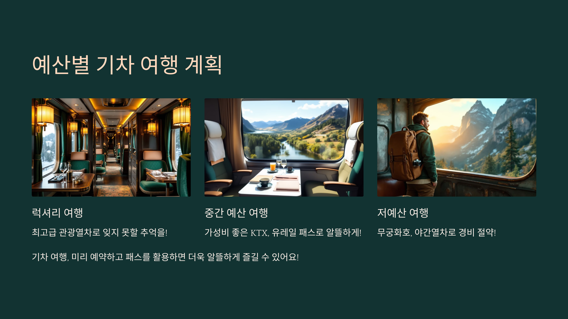 🎟️ **할인 티켓 활용하기** - 국내 KTX는 ‘내일로 패스’를 이용하면 저렴하게 여행할 수 있어요. - 해외 유럽 기차는 유레일 패스를 미리 구매하면 비용 절감 가능!