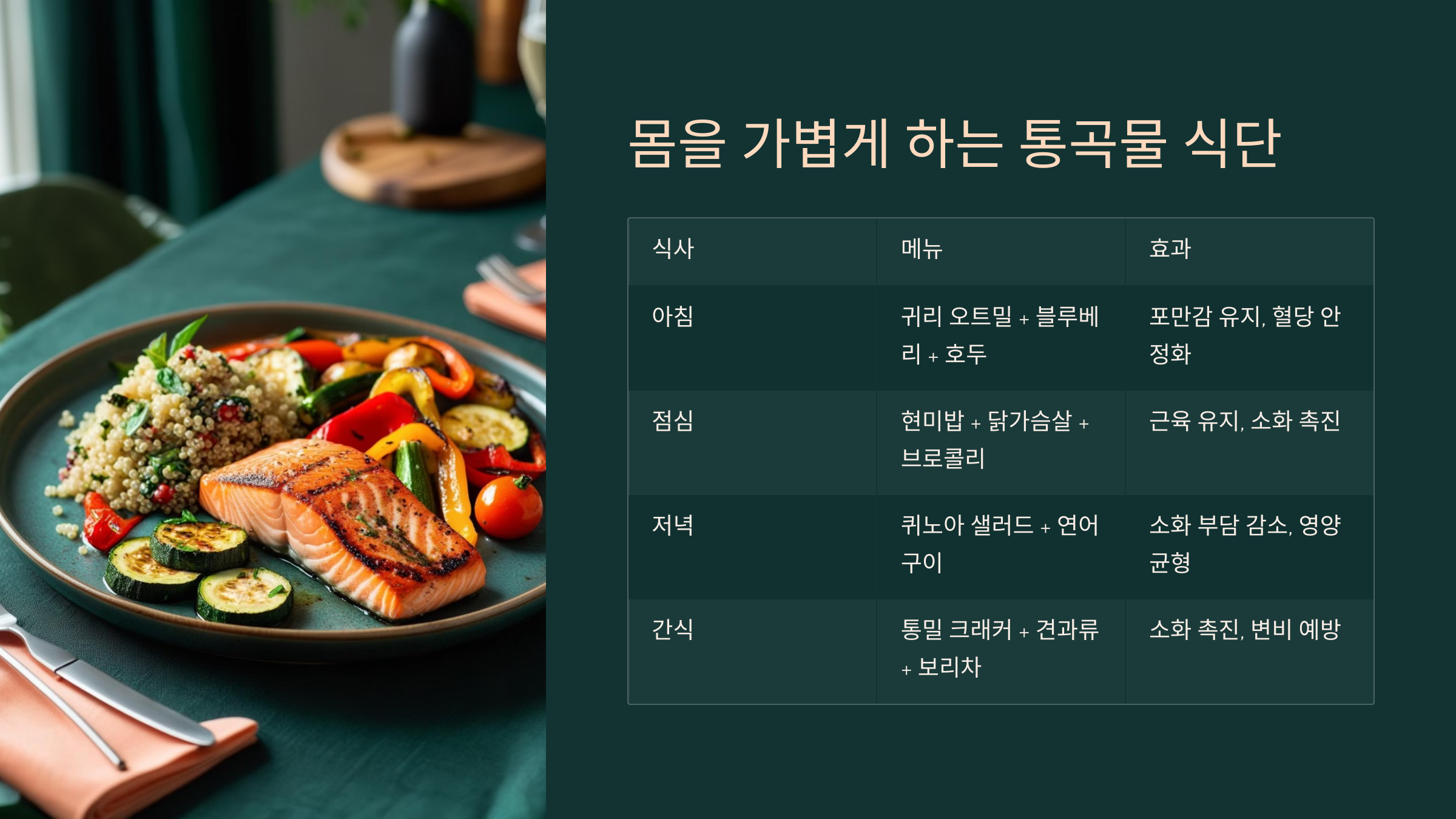 몸을 가볍게 하기 위해서는 단순히 통곡물을 먹는 것만으로는 충분하지 않아요. 채소, 단백질, 건강한 지방을 함께 섭취하면 포만감을 오래 유지하면서도 소화가 원활해져요. 하루 세 끼에 통곡물을 포함시키되, 과도한 섭취는 피해야 해요. 🍳