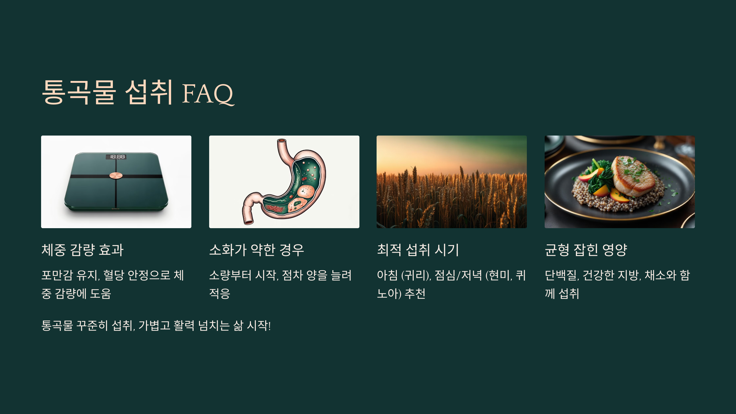 위와 같이 통곡물은 단순한 곡물이 아니라 건강과 활력을 유지하기 위한 필수 식품이에요. 특히 체중 감량과 소화 개선에 탁월하답니다. 🥗
