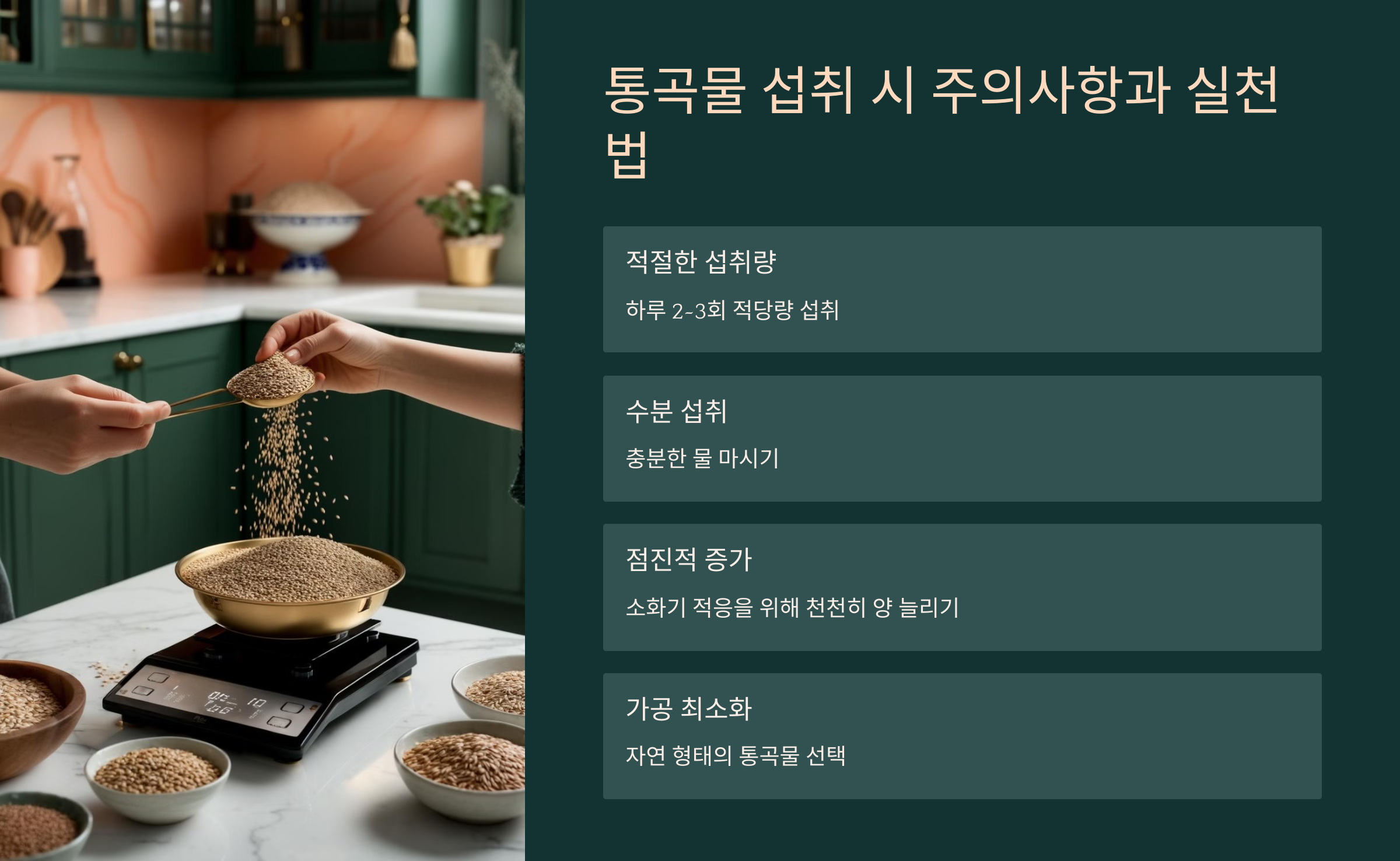 통곡물은 건강에 이로운 식품이지만, 올바르게 섭취하지 않으면 소화에 부담을 줄 수 있어요. 하루 2~3회 정도 적절한 양을 섭취하는 것이 좋으며, 물을 충분히 마셔야 식이섬유가 소화 과정에서 원활히 작용해요. 💧