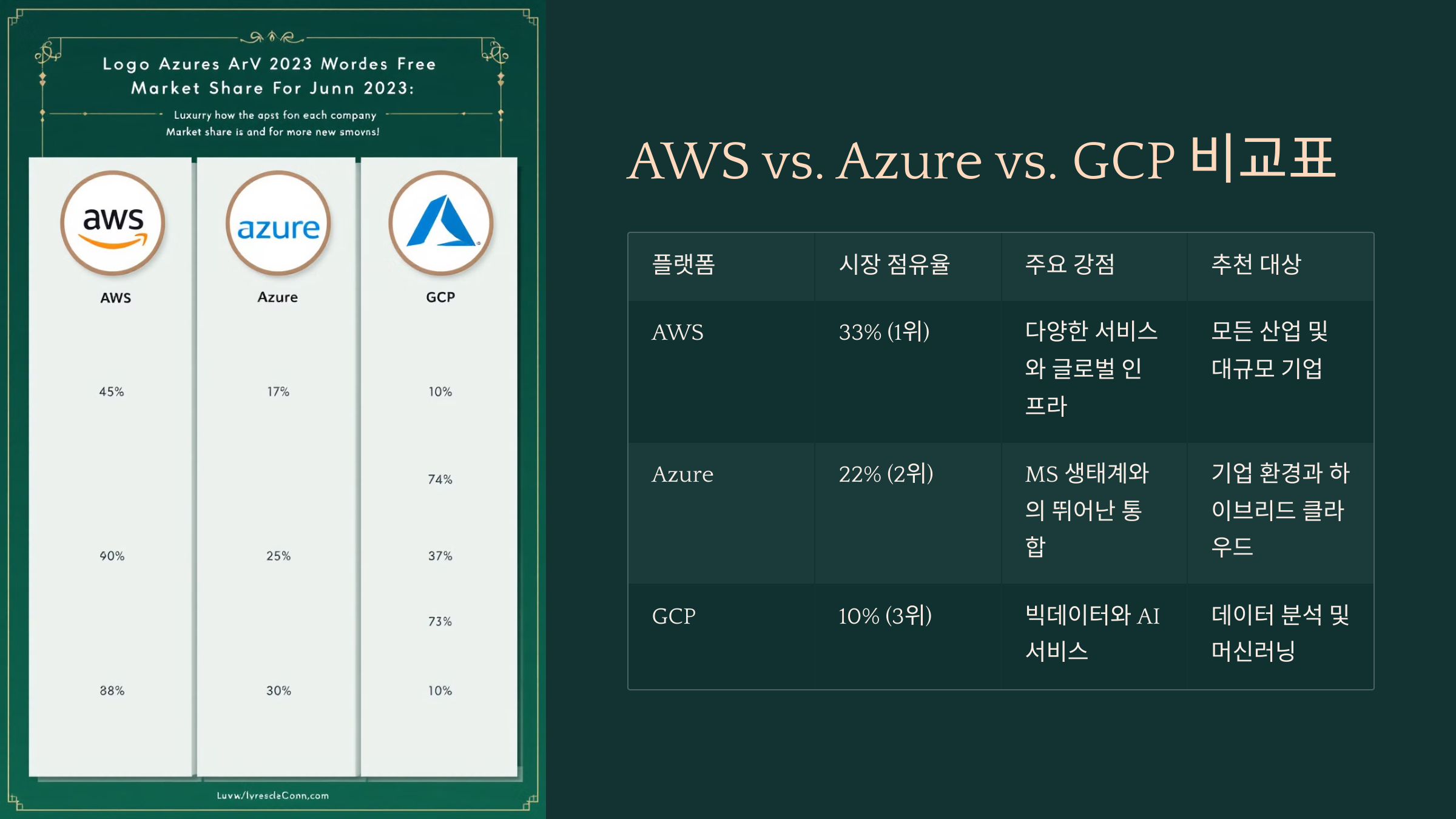이 표를 보면 AWS가 가장 많은 시장 점유율을 자랑하지만, Azure와 GCP도 각각의 강점을 가지고 있어요. 기업의 필요와 사용 사례에 따라 적합한 서비스를 선택하면 돼요. 🏆