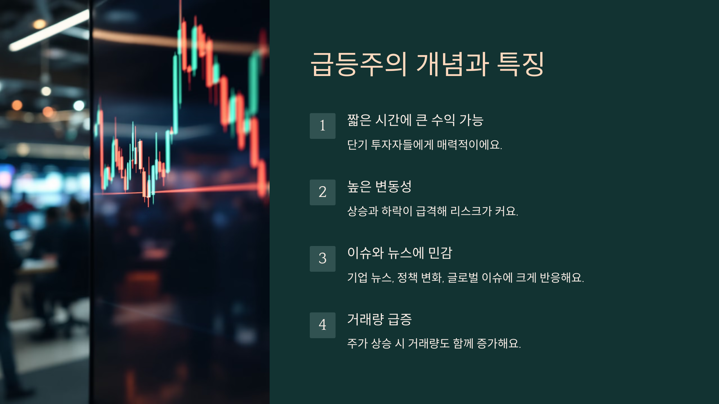 급등주를 잡으려면 시장의 흐름을 파악하고 정확한 타이밍에 진입해야 해요. 오늘은 급등주의 특징부터 예측 신호, 선정 방법, 그리고 단기 투자 전략까지 모두 알려드릴게요!