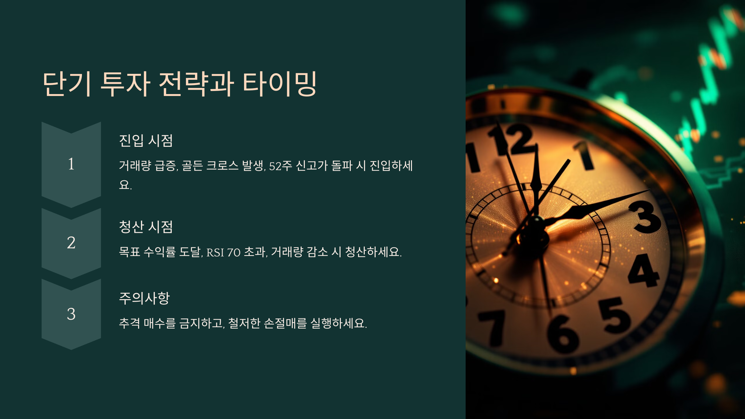 급등주에 단기 투자할 때는 **진입 시점**과 **청산 시점**이 가장 중요해요. 아래의 전략을 참고하세요. 😊