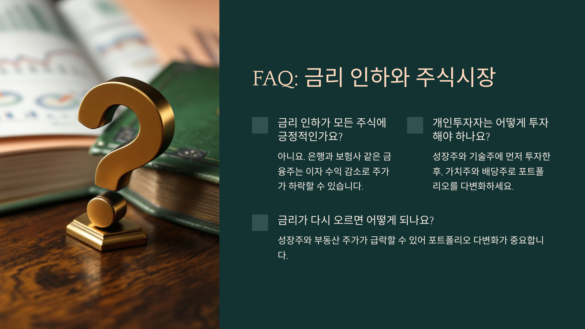 A1. 금리 인하는 기업의 **대출 비용을 낮추고 소비를 촉진**시켜 주식시장에 **긍정적인 영향**을 줘요. 특히 **성장주와 기술주**가 가장 큰 혜택을 받아 주가가 상승해요.