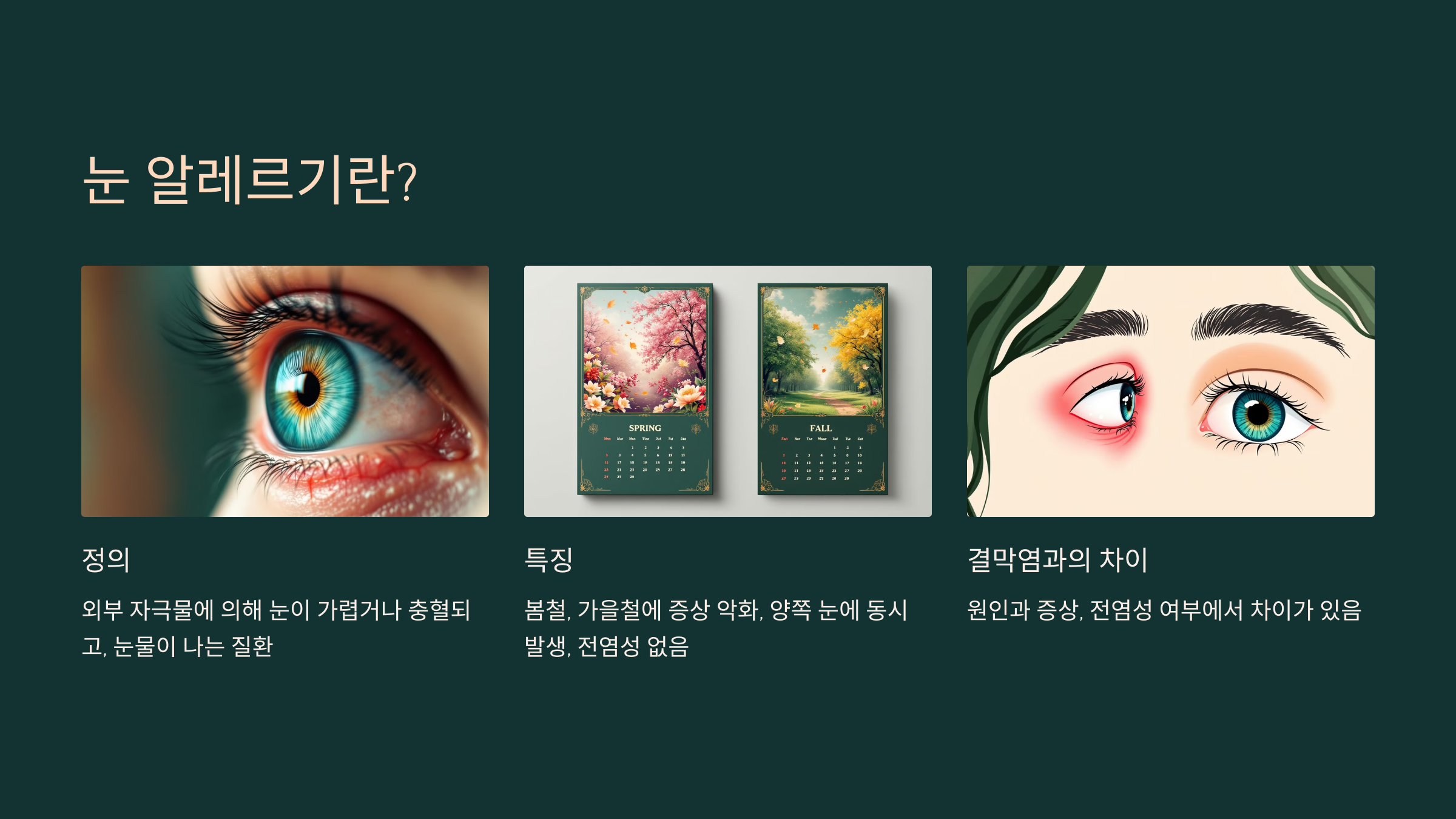 • 양쪽 눈에 동시에 발생 - 가려움과 충혈이 주된 증상 👀