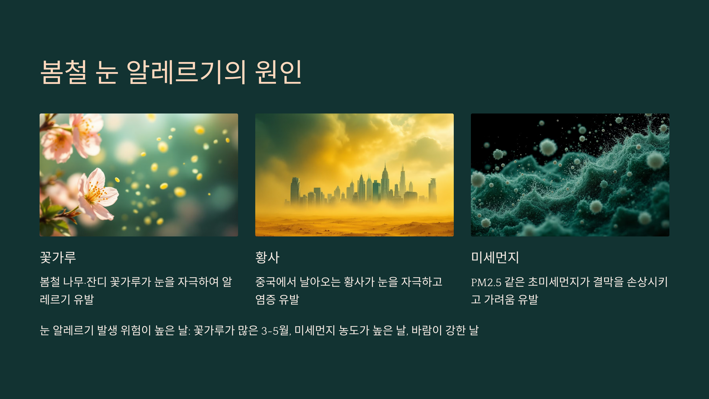 눈 알레르기의 기본 개념을 알았다면, 봄철 눈 알레르기가 발생하는 주요 원인을 살펴볼까요? 🍃