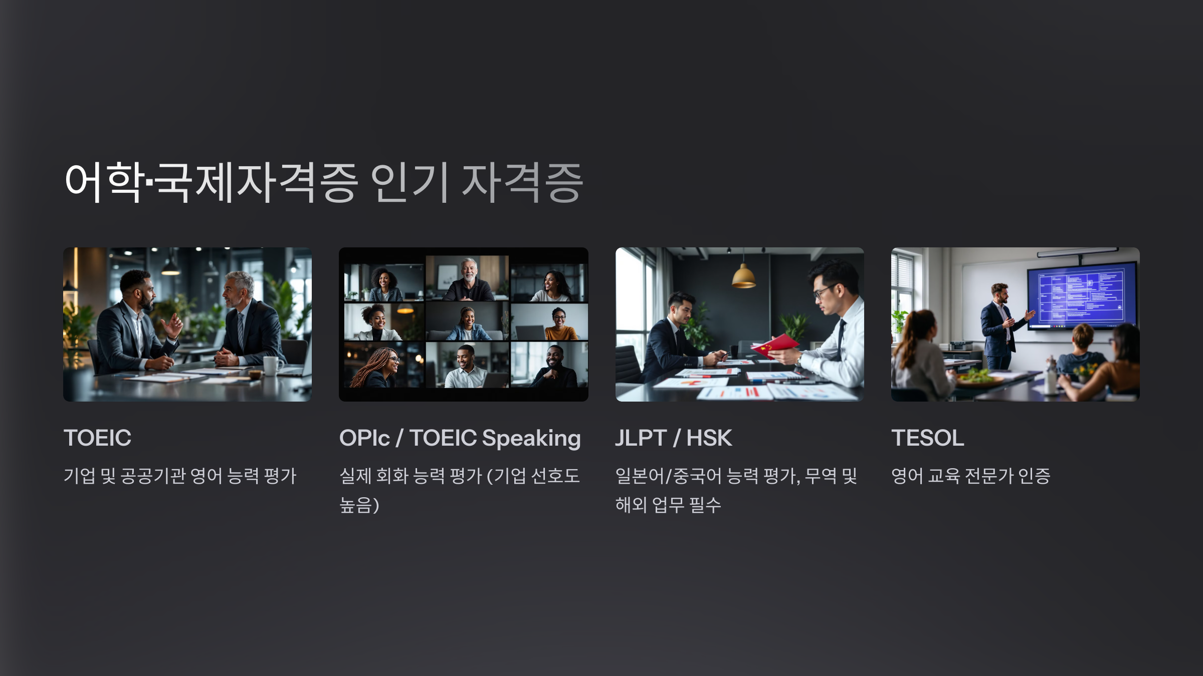 | TOEIC (토익) | 기업 및 공공기관 영어 능력 평가 | 외국계 기업, 무역, 해외 영업 |