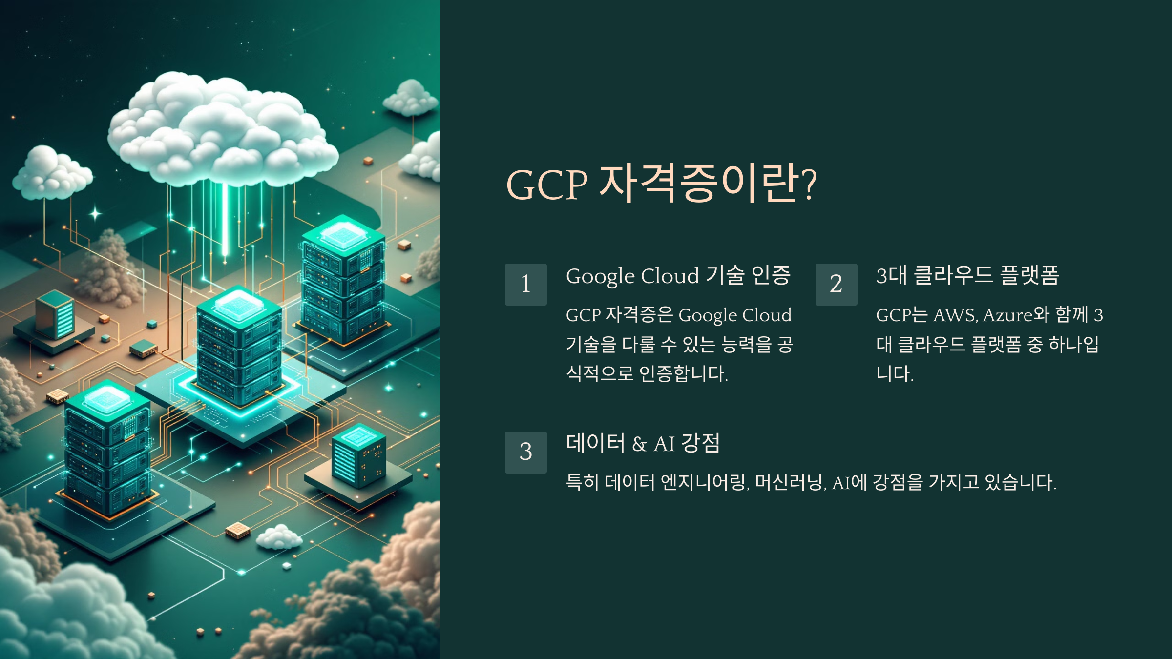 구글 클라우드 플랫폼(GCP) 자격증은 Google Cloud 기술을 다룰 수 있는 능력을 공식적으로 인증하는 자격증이에요. GCP는 AWS, Azure와 함께 3대 클라우드 플랫폼 중 하나로, 특히 데이터 엔지니어링, 머신러닝, AI에 강점을 가지고 있어요. 📊