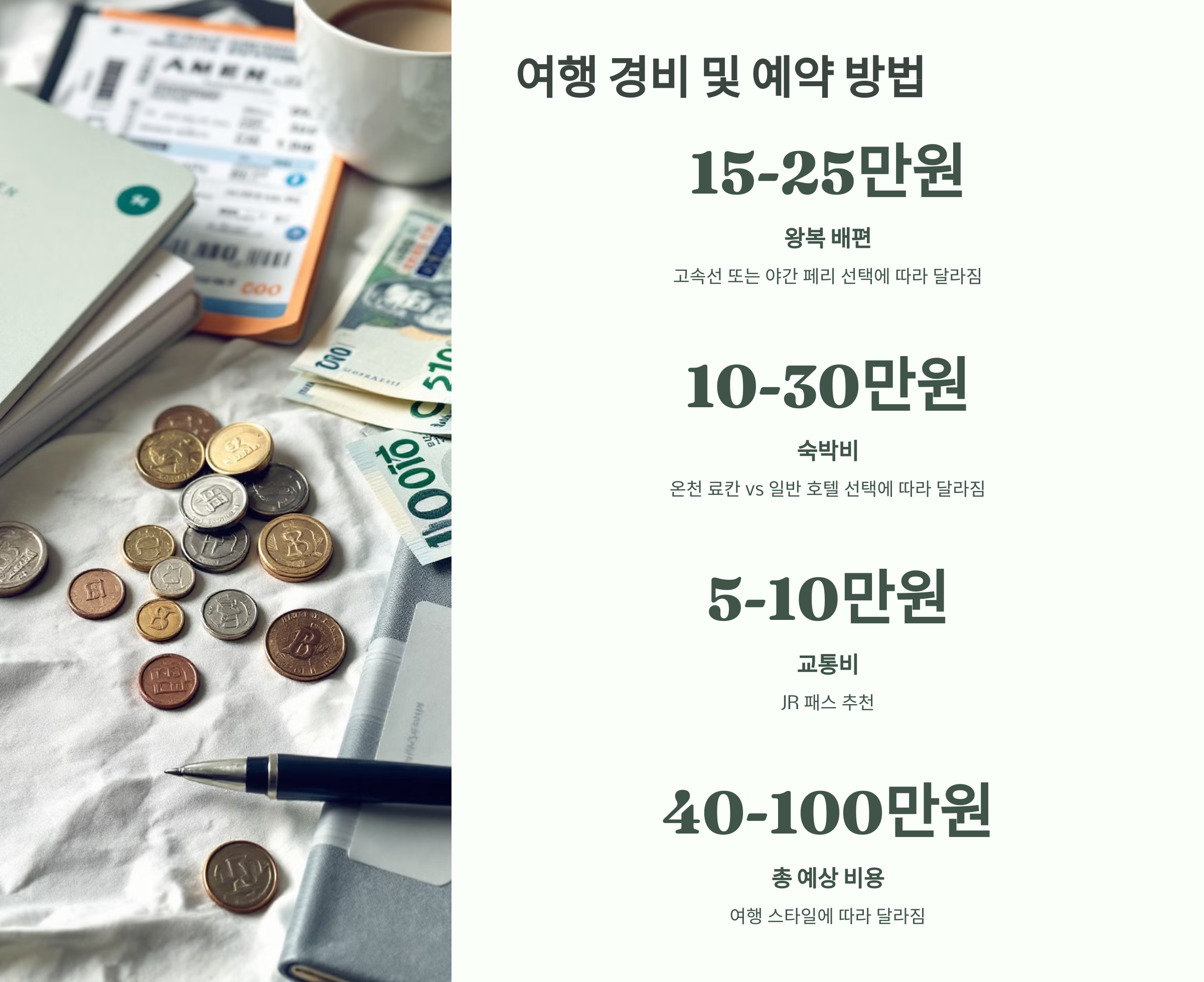 • 💎 럭셔리 여행: 80~100만 원 (고속선 + 온천 료칸 + 가이세키 요리 포함)